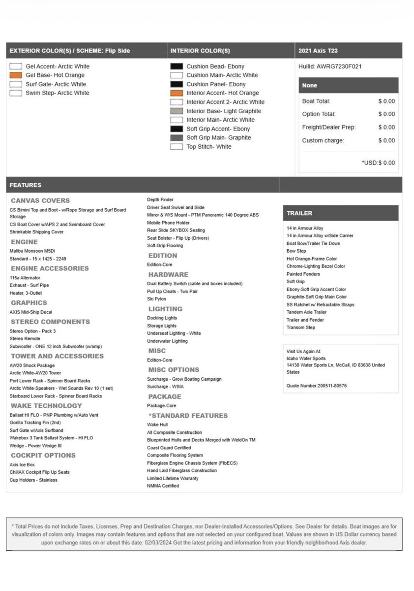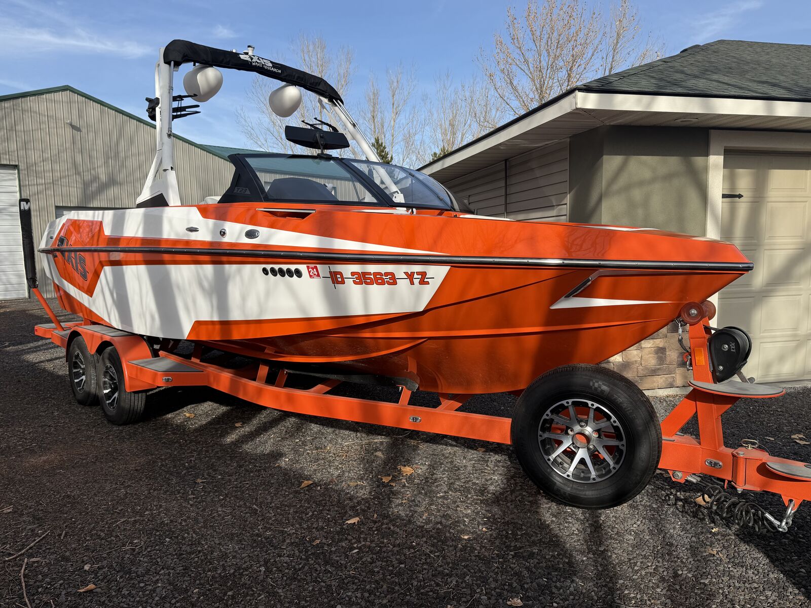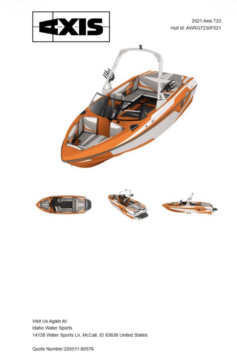 Only 176 hours! 2021 T 23 Axis Dreamsicle, cutom one of a kind color scheme. Very well maintained and cared for. Wiped and polished everytime it saw the water. Custom color scheme throughout. We have had zero issues with this dream boat. Easiest functioning boat for pulling any and all water sports. All service records available at Idaho Water Sports. Includes fold down bimini, speakers, and surf racks. ID water sports can fake lake to showcase that it's in good working order. Plesse make us an offer.