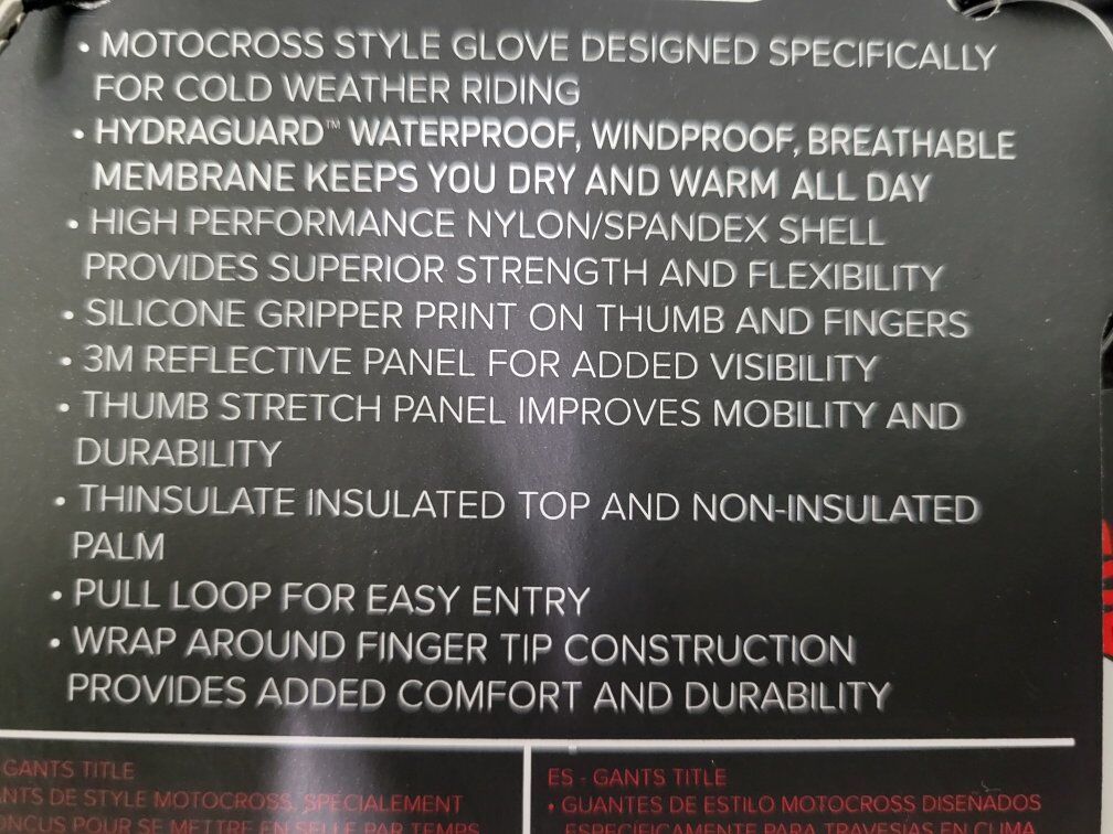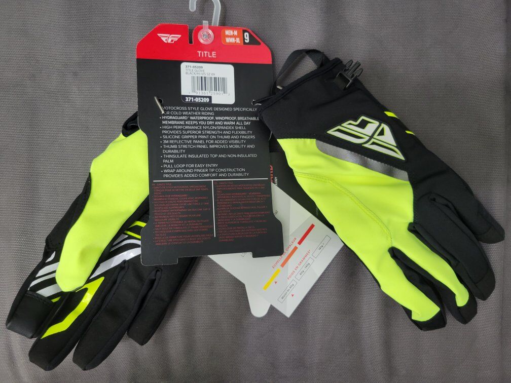 New with factory tags attached Fly Racing Title snowmobile gloves. Designed for snowmobiling but work great for all cold weather activities. Men's size medium (fit more like an small). They are waterproof.