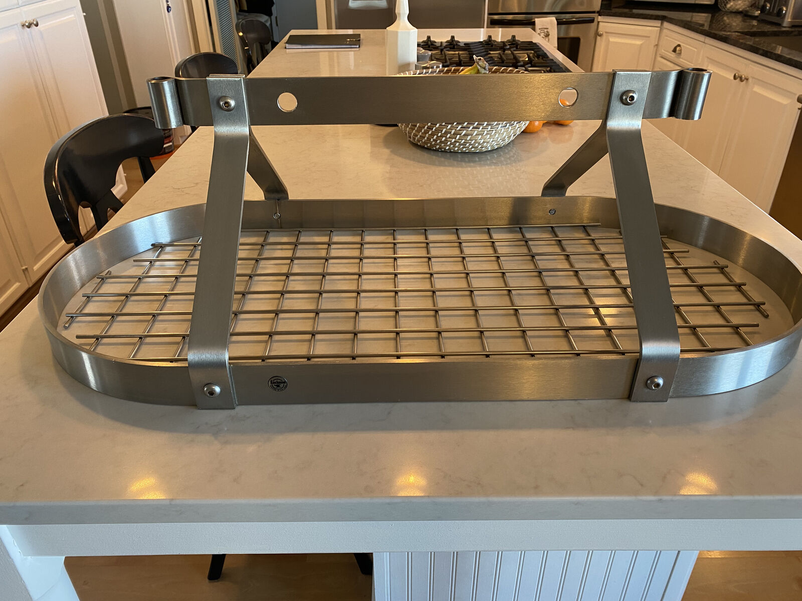 Enclume oval ceiling pot/pan rack in brushed stainless steel. In like new condition, with hooks, grate and mounting hardware. Measures 36 long x 16.5 wide x 12 high. Retails for over 1k new at Williams Sonoma. Asking $300 obo.