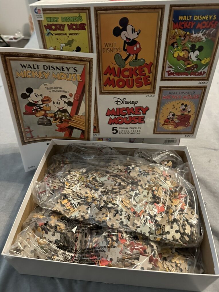 PayPalThis set contains five puzzles with varying piece counts: two 300-piece, two 500-piece, and one 750-piece puzzle. The puzzles feature classic Mickey Mouse poster art. When assembled, the puzzles measure 11 x 15 (300 pieces), 14 x 18 (500 pieces), and 24 x 18 (750 pieces). A bonus poster is included in the box to help with assembly.