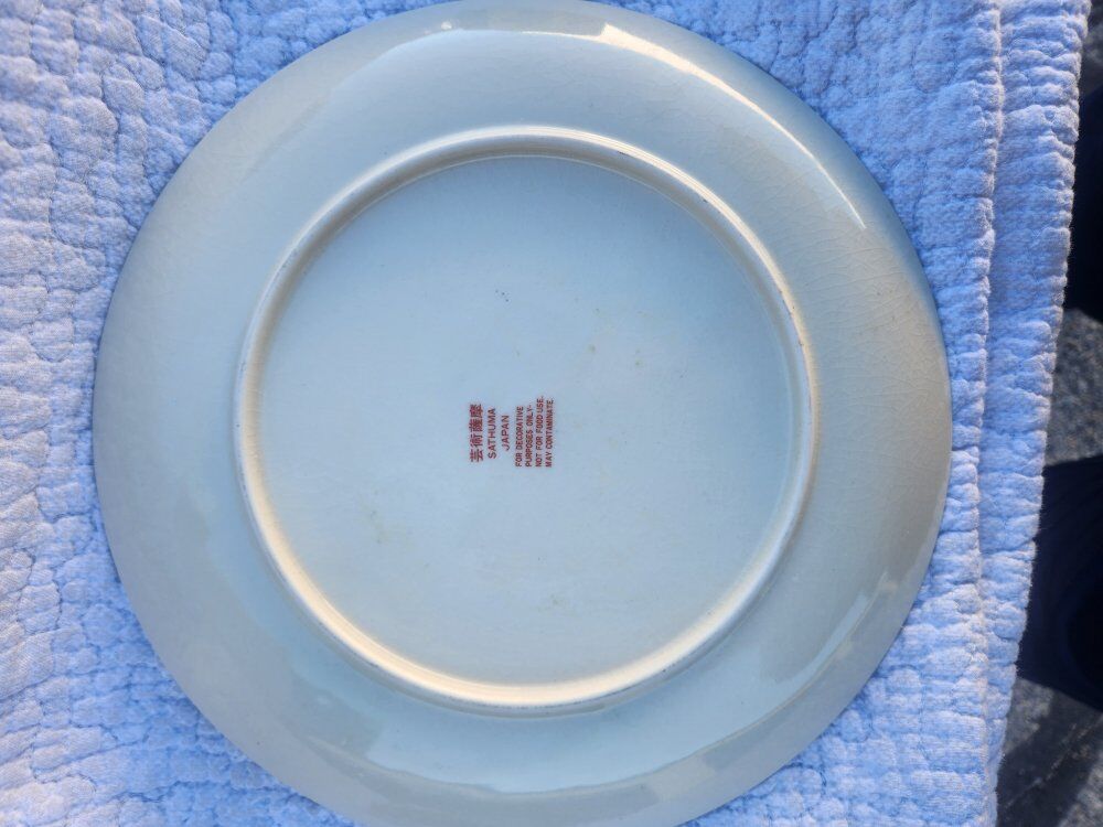 Vintage Antique Satsuma Japanese Plate featuring a peacock and peony glaze with gold trim. It is made of a white clay with a characteristic crackled, cream-colored glaze. The plate is for decorative purposes only and not intended for food use. Satsuma ware is a type of Japanese pottery, often richly decorated with fine detail and liberal use of gold. The English mark "Satsuma Japan" suggests it is likely a later export piece from the Meiji period (1868-1912) or later.