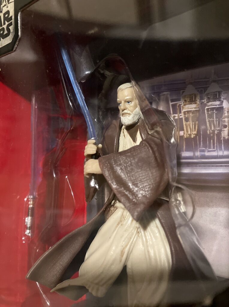 New in box. Box has a little wear around corners. It is part of the 40th Anniversary collection for the 1977 film Star Wars: A New Hope. The 3.75-inch scale figure features a die-cast body with plastic parts for the head, arms, hands, lower tunic, and robe. It was released by Hasbro in 2017 and comes with two lightsabers, a display stand, and a reversible backdrop. The figure has six points of articulation, primarily in the neck, shoulders, wrists, and waist. Walmart and Amazon list for $20+