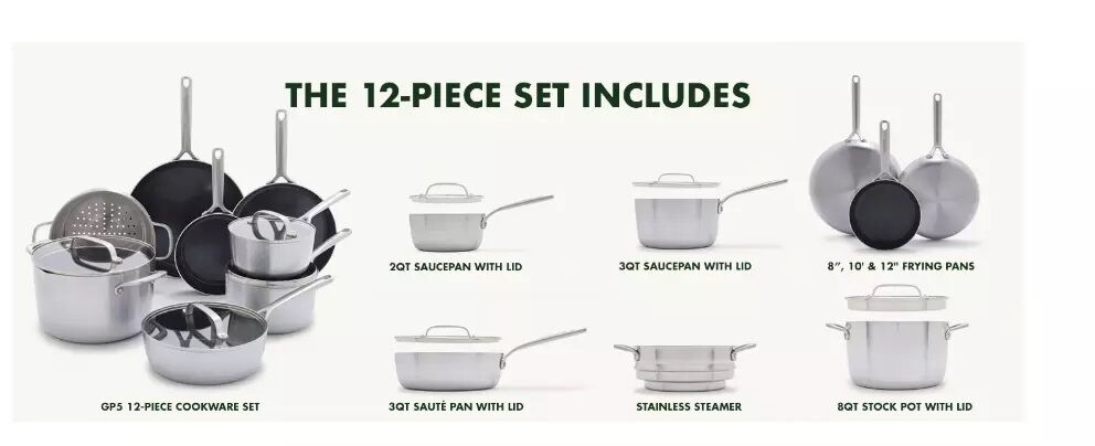 We have one GreenPan GP5 Vista 12-piece Stainless Steel Ceramic Nonstick Cookware Set 1787425 #98799 available. This cookware set is Like New and comes in the original box.