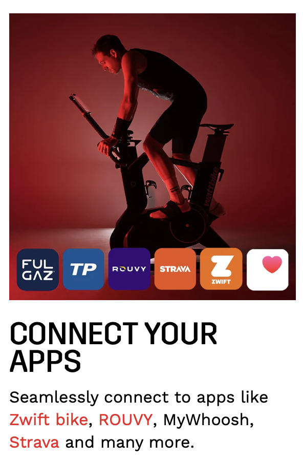 This next-generation smart bike delivers stunning ride realism, dual-chain/belt drivetrain with ultra-smooth gear changes, and app connectivity to platforms like Zwift, ROUVY, TrainingPeaks and Strava.
