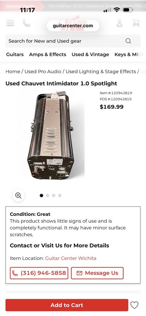 Nice, Good working chauvet intimidator 1.0 spotlight in good working condition! This exact spotlight is 169.99 at guitar center right now! as shown in photos! ! Pick up and use today! No waiting! Don’t pay retail prices, call Dustin instead at 801-205-3404, I need it gone!