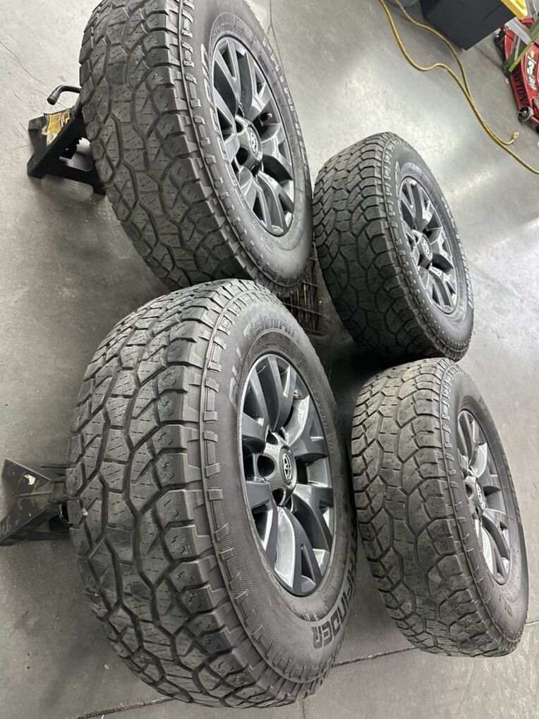 ZelleWhole setup is in really good shape! 16in OEM Toyota Tacoma space grey wheels 245/75/16 pathfinder all terrain tires
