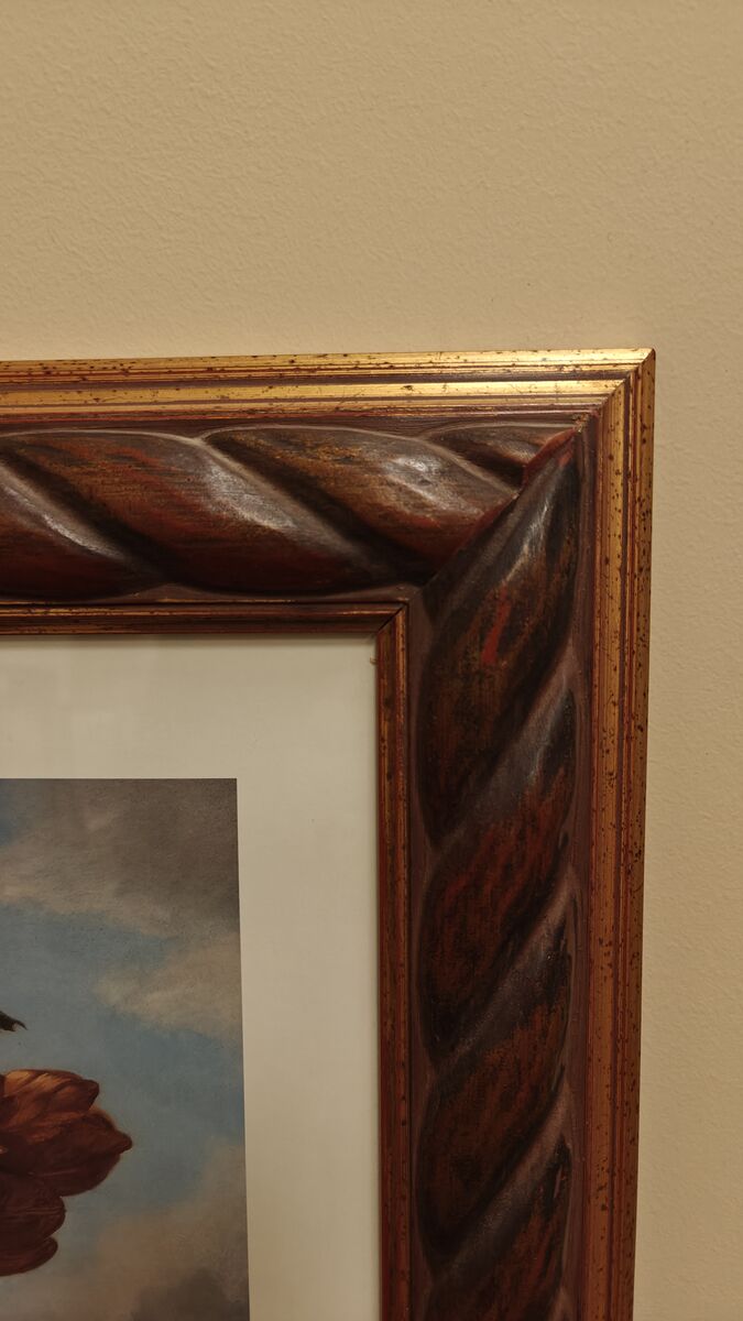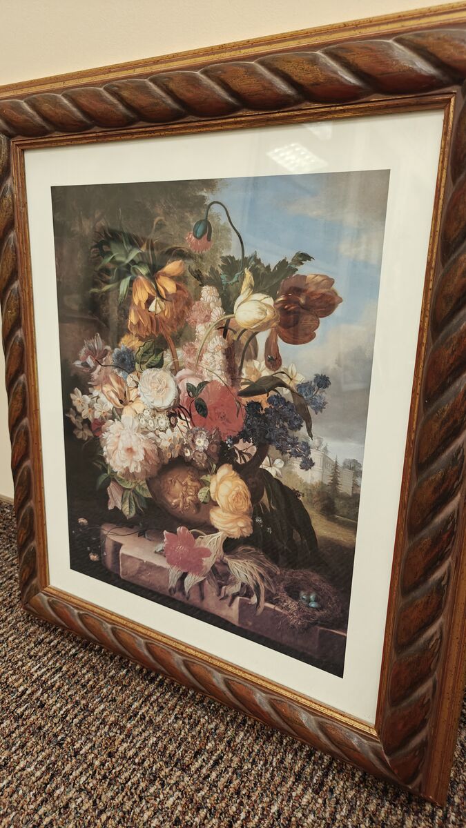 ZelleElegant framed floral still life artwork featuring a rich bouquet arrangement in warm, timeless colors. The piece is beautifully complemented by an ornate carved-style frame, giving it a traditional, upscale look.