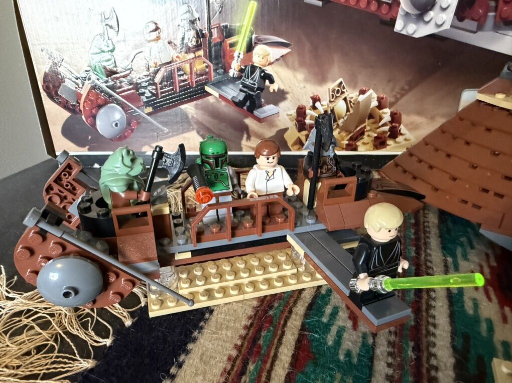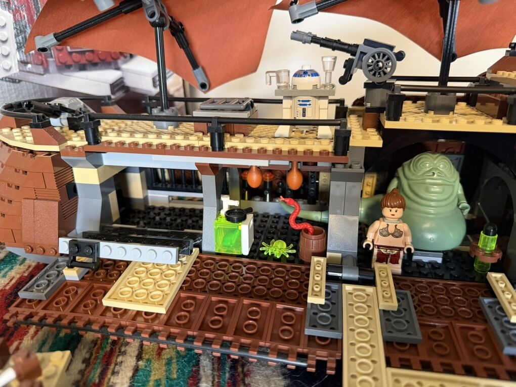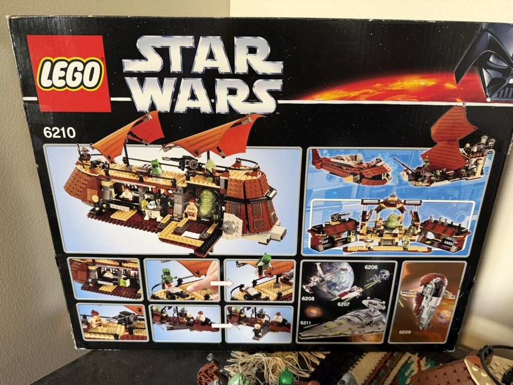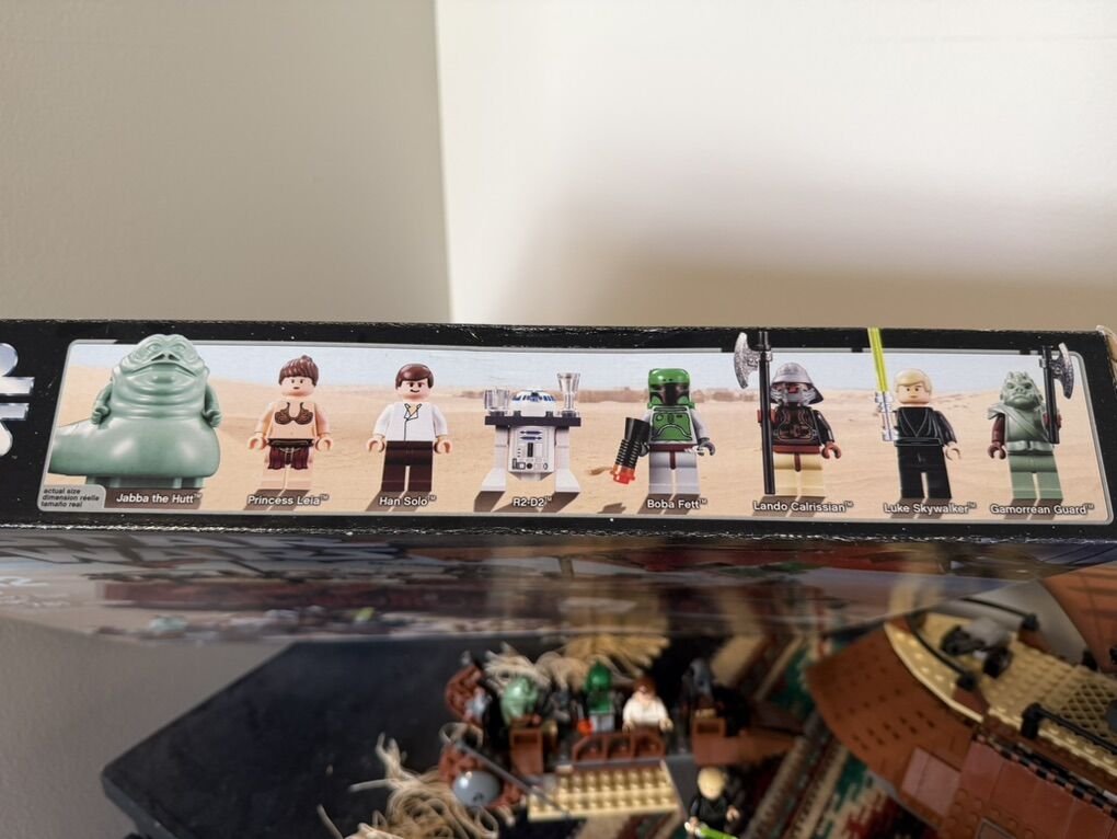 Awesome set from 2006 and is definitely one of my favorites. This is a complete set with all the minifigures (Jabba the Hutt, Princess Leia, Han Solo, R2-D2, Boba Fett, Lando Calrissian, Luke Skywalker, and Gamorrean Guard), the original box, and the original instruction manual. Everything in this set is in really good condition. The only issue is that the left hand on the Gamorrean Guard is broken and that is shown in the last picture.