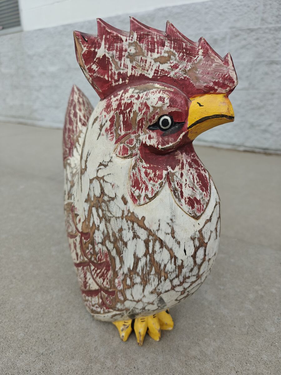 ZelleHand-carved wooden rooster décor with a rustic, distressed finish. Solid and sturdy, great for farmhouse, country, or cottage décor. Perfect for kitchens, porches, shelves, or garden displays (covered area recommended)