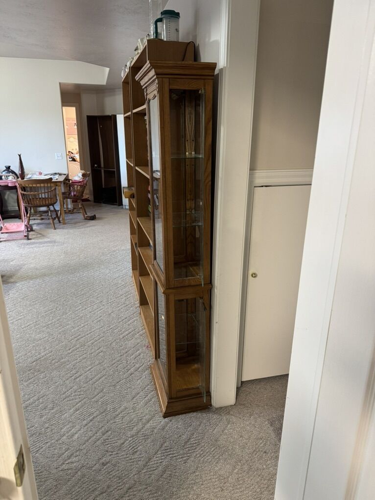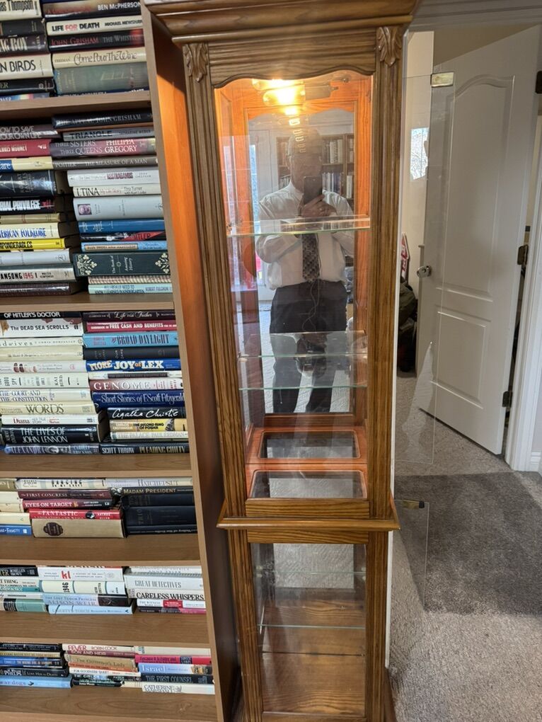This a tall, narrow, wooden curio cabinet with a glass door and shelves, featuring an internal light and a mirrored back panel. These types of cabinets are designed to display collectibles, heirlooms, or decorative items while using minimal floor space.