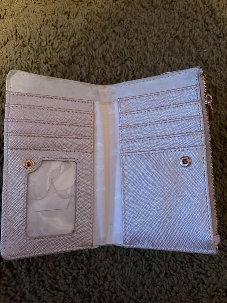 Loungefly Disney Princess Ultimate Celebration wallet, also referred to as the Rose Gold or Royalty edition. Features an all-over print of various Disney Princess silhouettes (including Cinderella, Tiana, Ariel, Mulan, and more) The zipper is rose gold.
