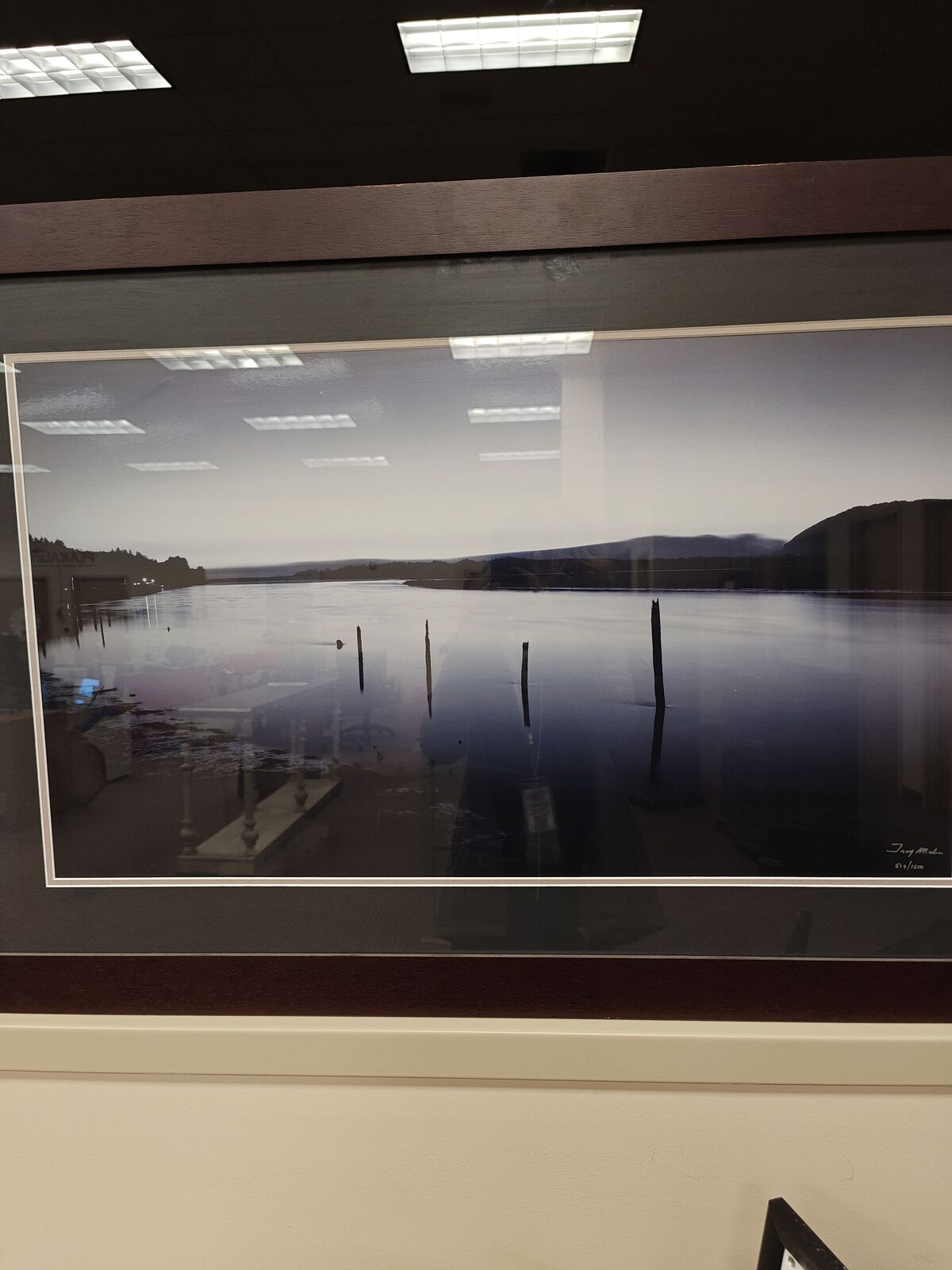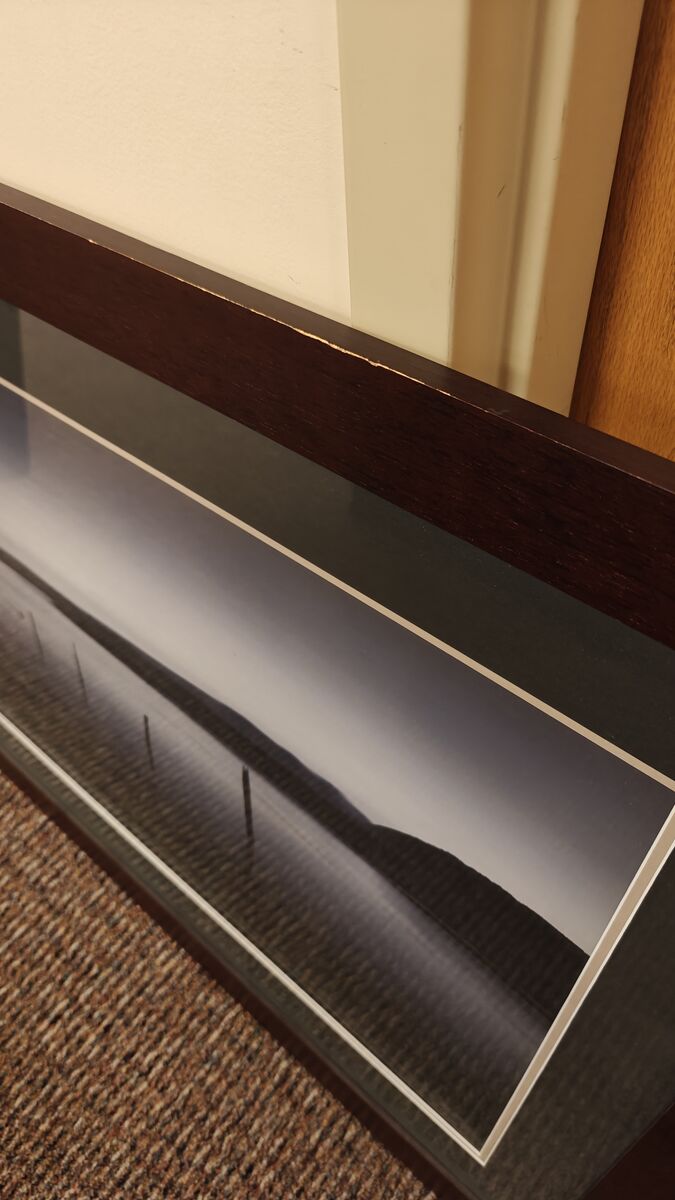 ZelleBeautiful large landscape print in a dark wood frame. Peaceful waterfront scene with soft tones and long-exposure style sky streaks. Professionally framed and matted.