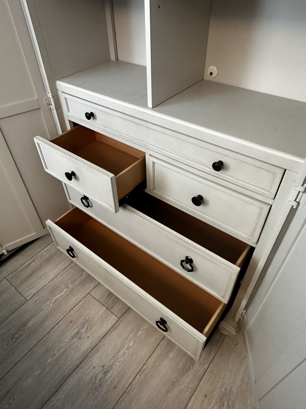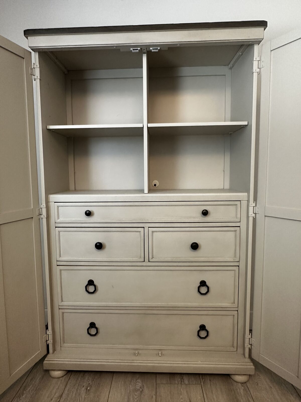 ApplePayThis is an authentic Legacy Classic Furniture piece — Model No. 6400-2400 from the Brookhaven collection. Finished in Vintage Linen with a contrasting rustic Dark Elm wood top, this piece blends traditional craftsmanship with a relaxed, refined aesthetic and works equally well in a living room, dining area, bedroom, or entry. The chest features paneled doors that open to generous interior storage—ideal for linens, barware, games, or household essentials. The neutral painted finish pairs effortlessly with a wide range of décor styles, while the solid wood top adds warmth and character. Built with Legacy Classic’s known attention to quality and durability, this is a substantial, heirloom-style piece that elevates a space without feeling formal. Details: Legacy Classic Furniture – Brookhaven Collection Door chest / storage cabinet 5 drawers including jewelry tray Vintage Linen painted finish Rustic Dark Elm wood top Paneled doors with interior shelving Solid, well-built construction Clean, well-maintained condition Approximate dimensions are 68 tall, 18 deep and 43 wide. A versatile, high-quality storage piece with timeless appeal, this premium Brookhave piece originally sold for well over $1000.