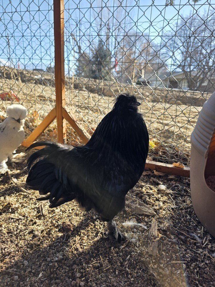 I ended up with another silkie Rooster out of my growouts. He's about 6 months old and has beautiful coloring/sheen on his feathers.