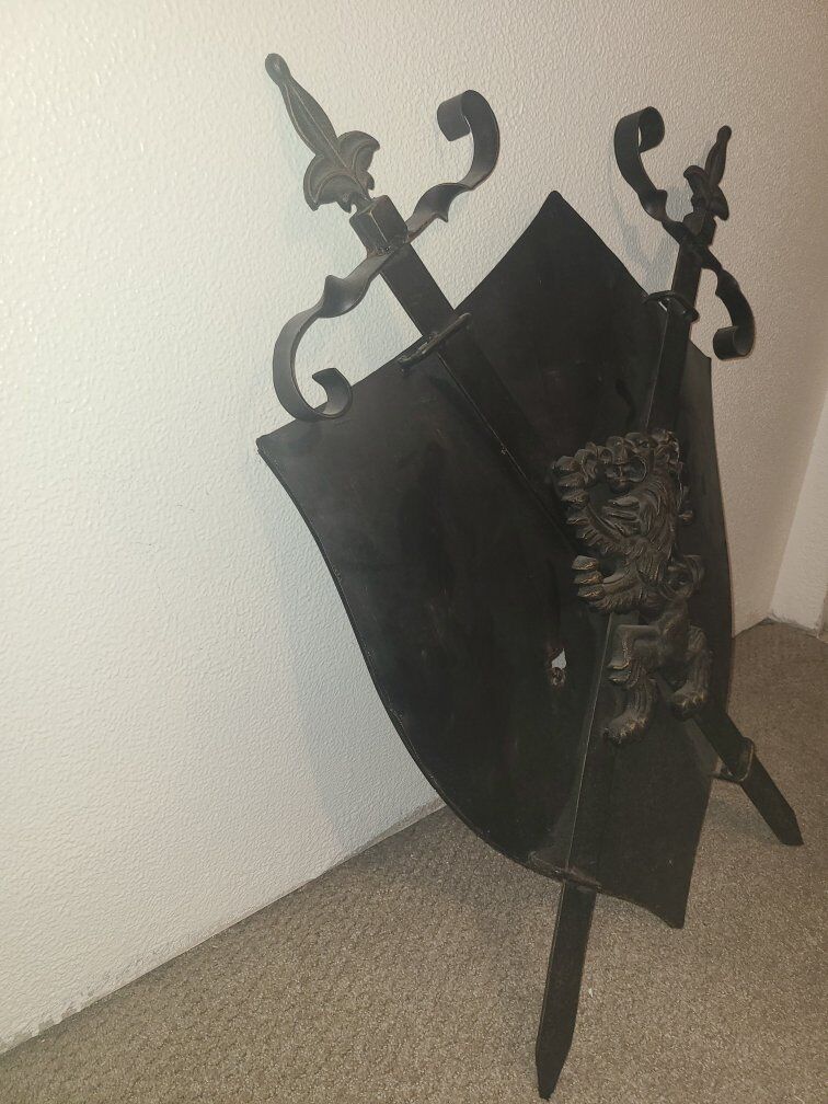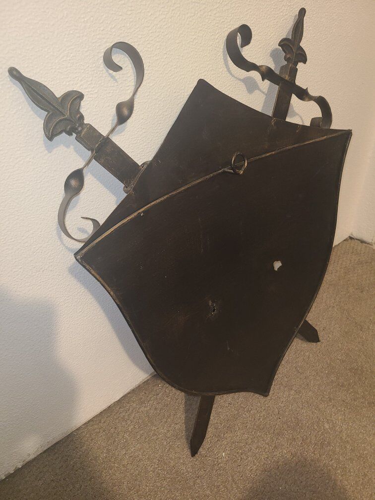 medieval shield with lion and swords. heavy metal with hook on the back for easy hanging. originally had two candles but they broke off and now has 2 small holes shown in photo is an example of what it looked like before they broke off.