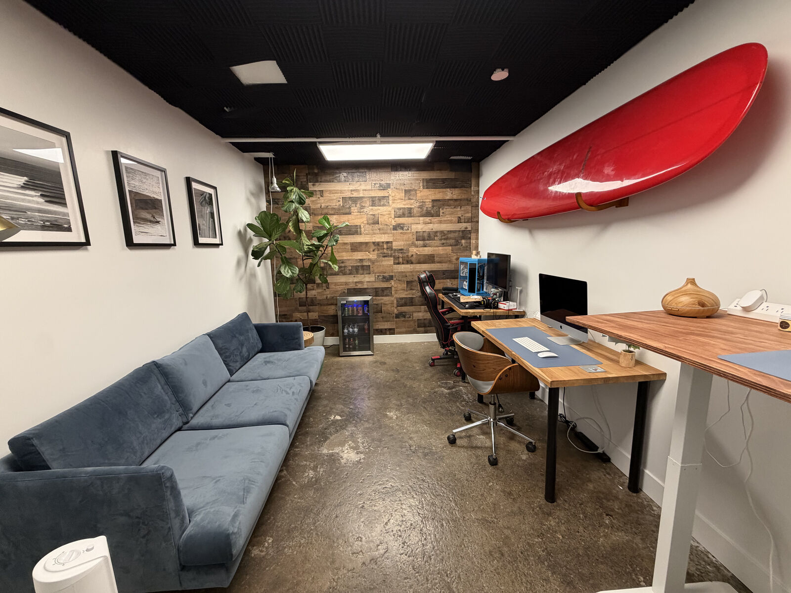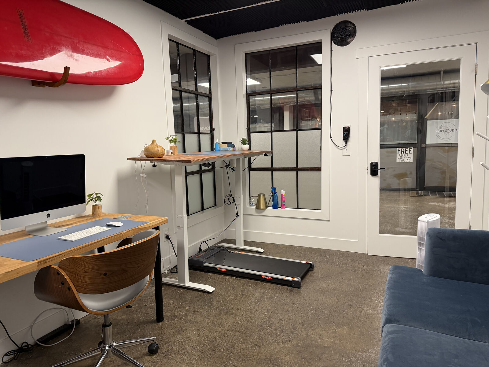 Suite 014 in the Bright Building. Faux wood wall along the back wall.