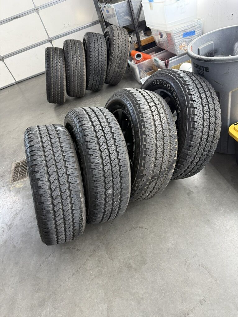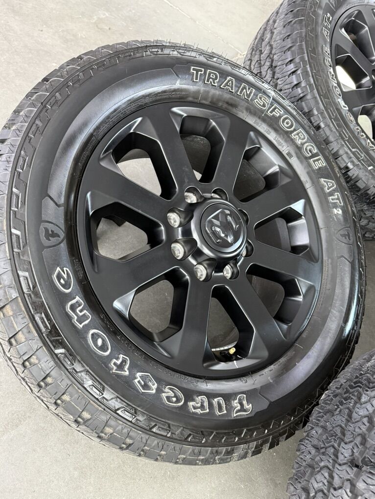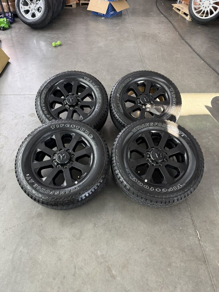 Wheels are 20in OEM wheels off a 2026 ram 3500 midnight package. Wheels are in perfect shape, brand new takeoffs. No curb rash dings or damage, all of the center caps are also included and in perfect shape as well. Tires are 285/60/20 Firestone transforce all terrain, load range E, top of the line tires. No patches or plugs, less then 500 miles so they are pretty much brand new.