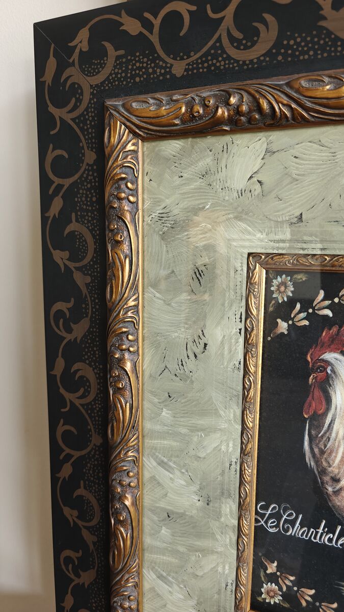 ZelleDecorative framed rooster artwork titled “Le Chanticleer.” Features a classic French country / farmhouse style rooster illustration set in an ornate, layered frame. The frame has carved detailing with gold accents and a hand-finished look, giving it an elegant, vintage feel. Neutral green, black, and gold tones make it easy to pair with a farmhouse, cottage, or traditional décor.