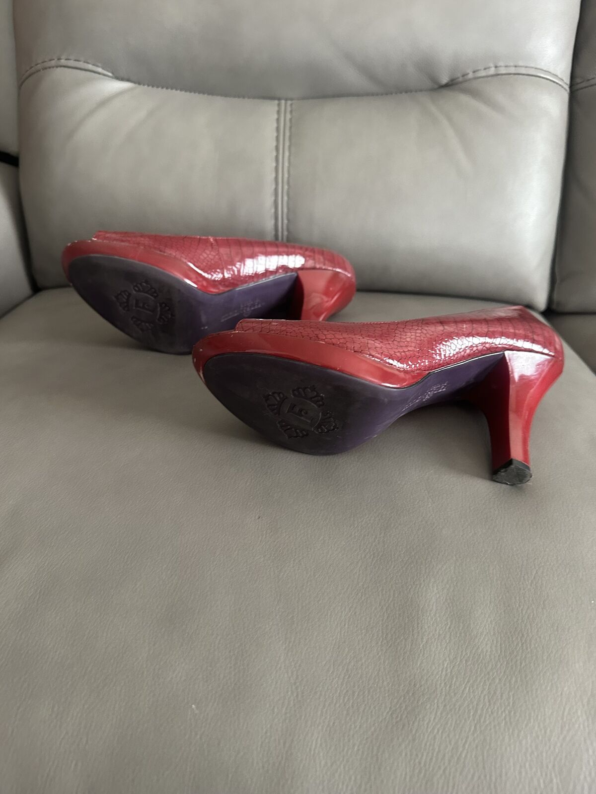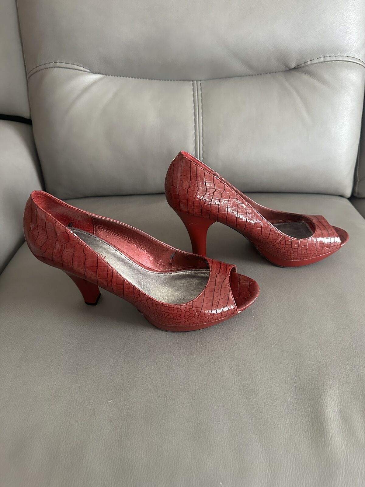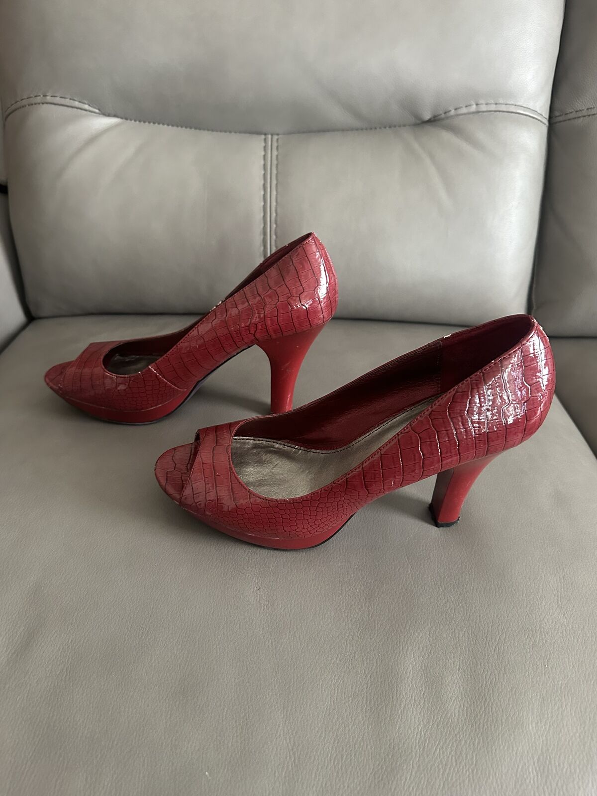 VenmoFergalicious by Fergie deep red crocodile print open toe heel. US Size 10. Please look at all pictures to get a good idea about the item. Cross Listed. Located in Spanish Fork. I accept cash or Venmo. First come, first served, NO HOLDS.