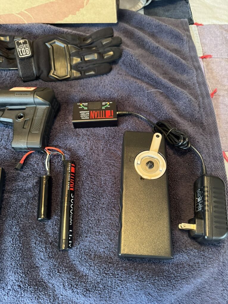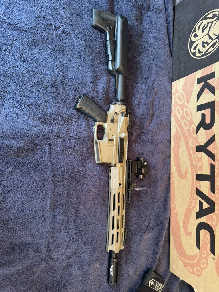 Krytak Trident MK II CRB-M in Flat Dark Earth Riser & optic protector plate Red & Green dot optic Bifrost Tracer with single color or RGB mode Dye i5 mask - Black with Blue Lense ( no scratches on lense) 2 magazines - 1 krytak + other EMG M12 sidewinder speed loader FPS power down ring kit — whole kit included 1 3000mah battery & charger Extra tracer & normal bbs Large black gloves