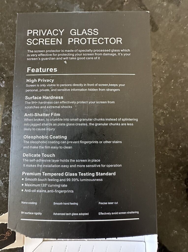 VenmoPrivacy glass screen protector. High privacy. Anti shatter film. What you see in photo is what’s included.