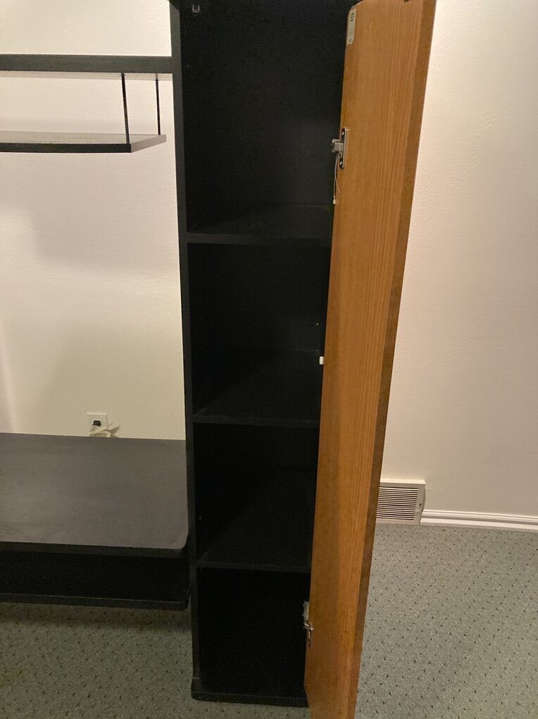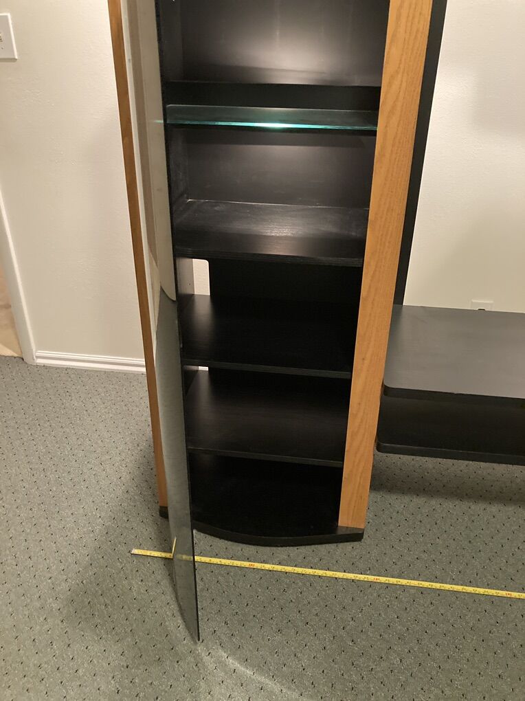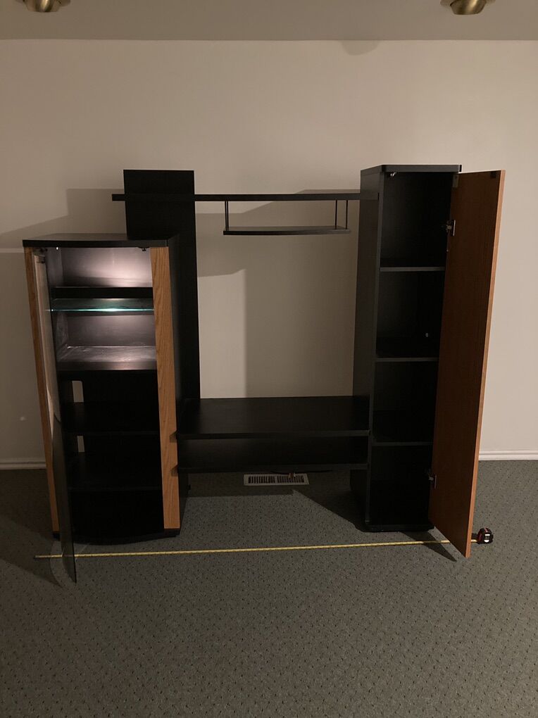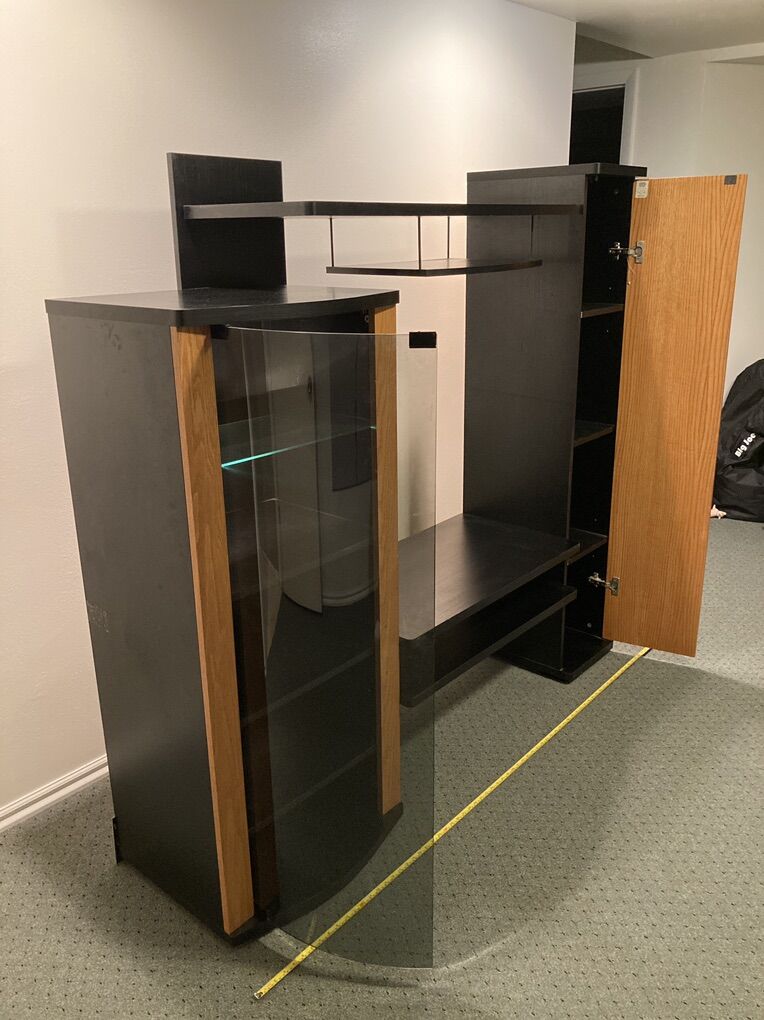 This entertainment center was purchased from San Francisco design. It has a light in the glassed area. It is in excellent shape and total width is about 6 feet. It can fit a 32 inch tv.