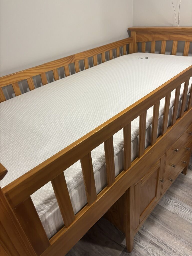 ZelleSet consists of a loft bed, dresser, and desk. Desk and dresser both can be below the bed or completely separate from it. Also comes with newly purchased mattress and cover.