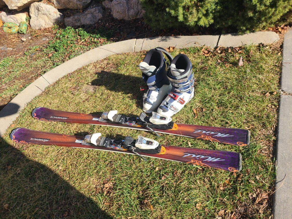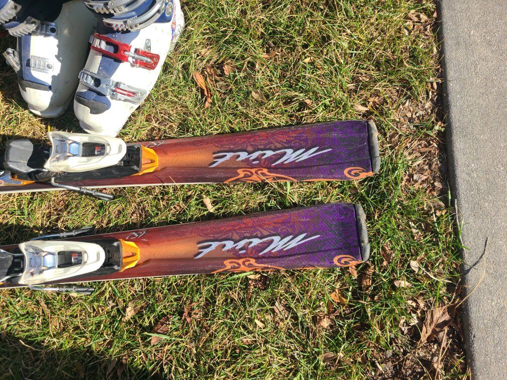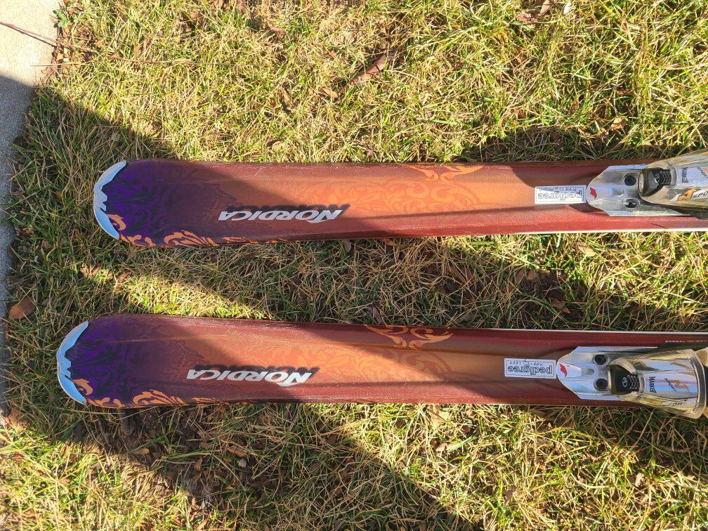 Nordica mint 152 cm tall, sidecut 112, 74, 105. r11. comes with adjustable marker bindings Sport bindings.