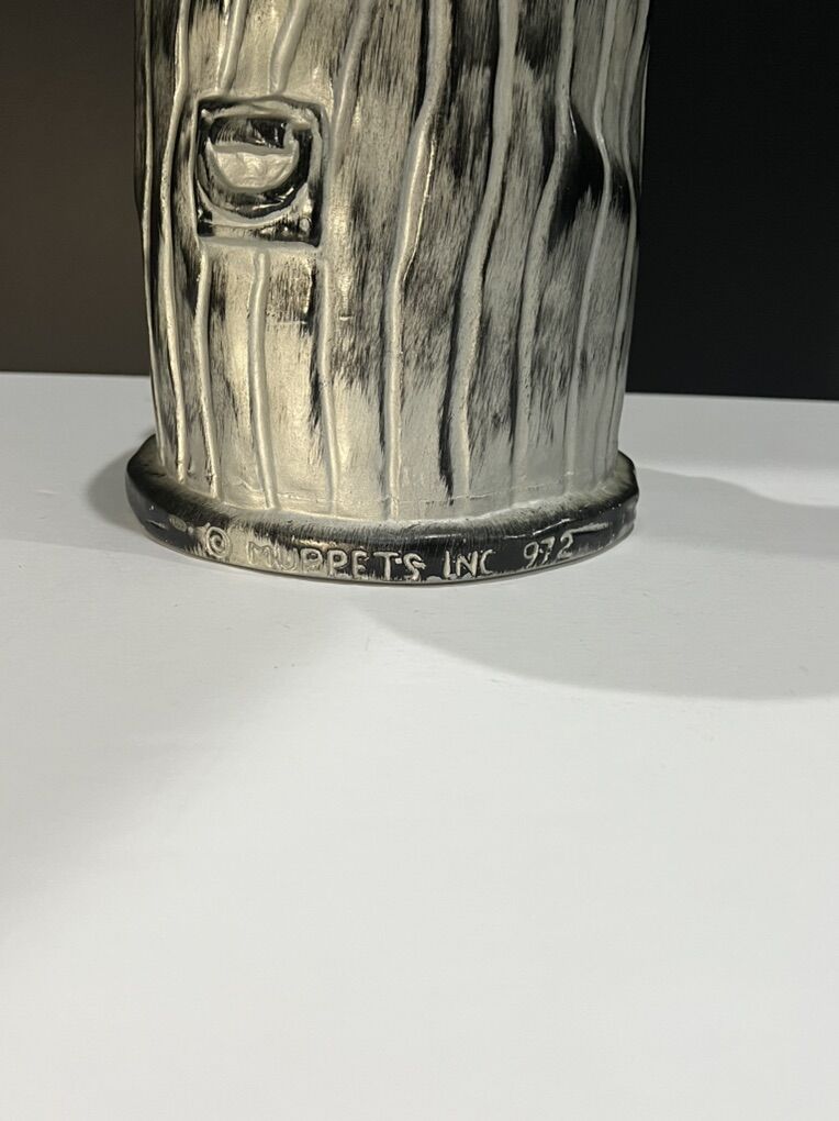 VenmoVintage Oscar the Grouch ceramic cookie jar. Sesame Streets beloved Muppet character peeking out from his iconic garbage can home. The jar is made of ceramic and porcelain with a glazed, hand-painted finish. The jars typically stand around 11 inches tall.