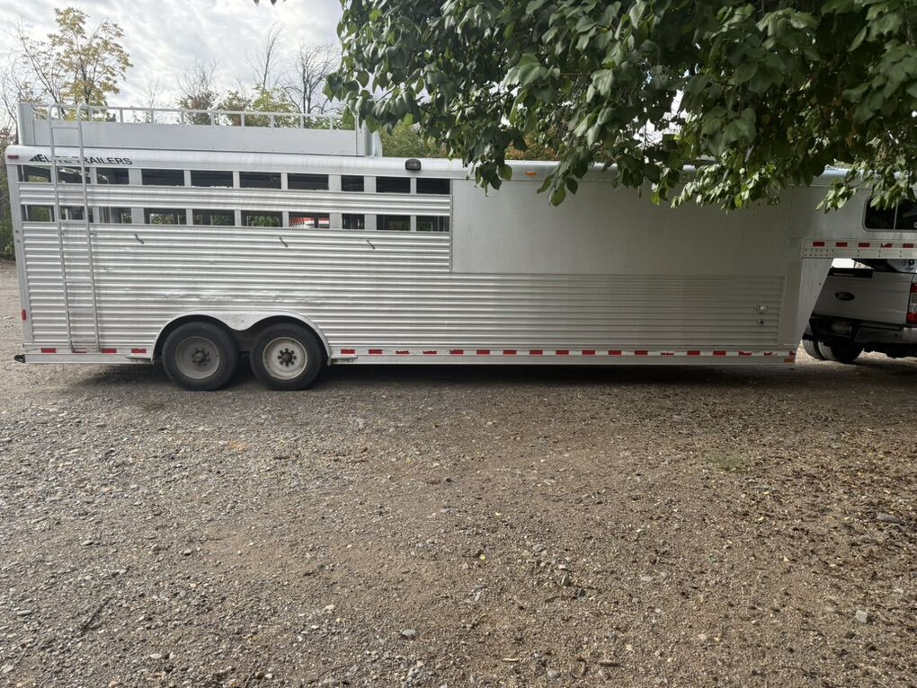 07 elite stock combo. 28’ on the floor. 8’ wide 15’ stock area with an adjustable sliding center gate. 4’ mid tack lots of bridle hangers blanket rack and 4 saddle racks. 9’ Weekender with a sink microwave and closet. Comes with a mini fridge. Has a cowboy shower hot water heater. Does have some dents on the sides in the stock area from hauling bucking horses in it. Huge hay rack. Great trailer really hate to let it go but with a growing family we need a bigger trailer