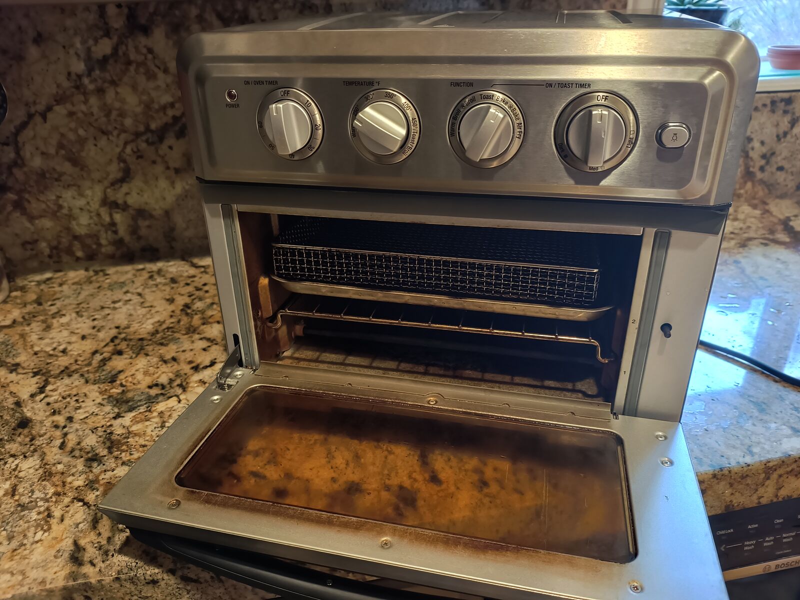 Broken function knob stuck in bake function. Everything else works so we have just been using bake function to toast and bake. Could be used for parts or countertop oven. Knob sounds difficult to replace, but if you know what you are doing, it could be possible.
