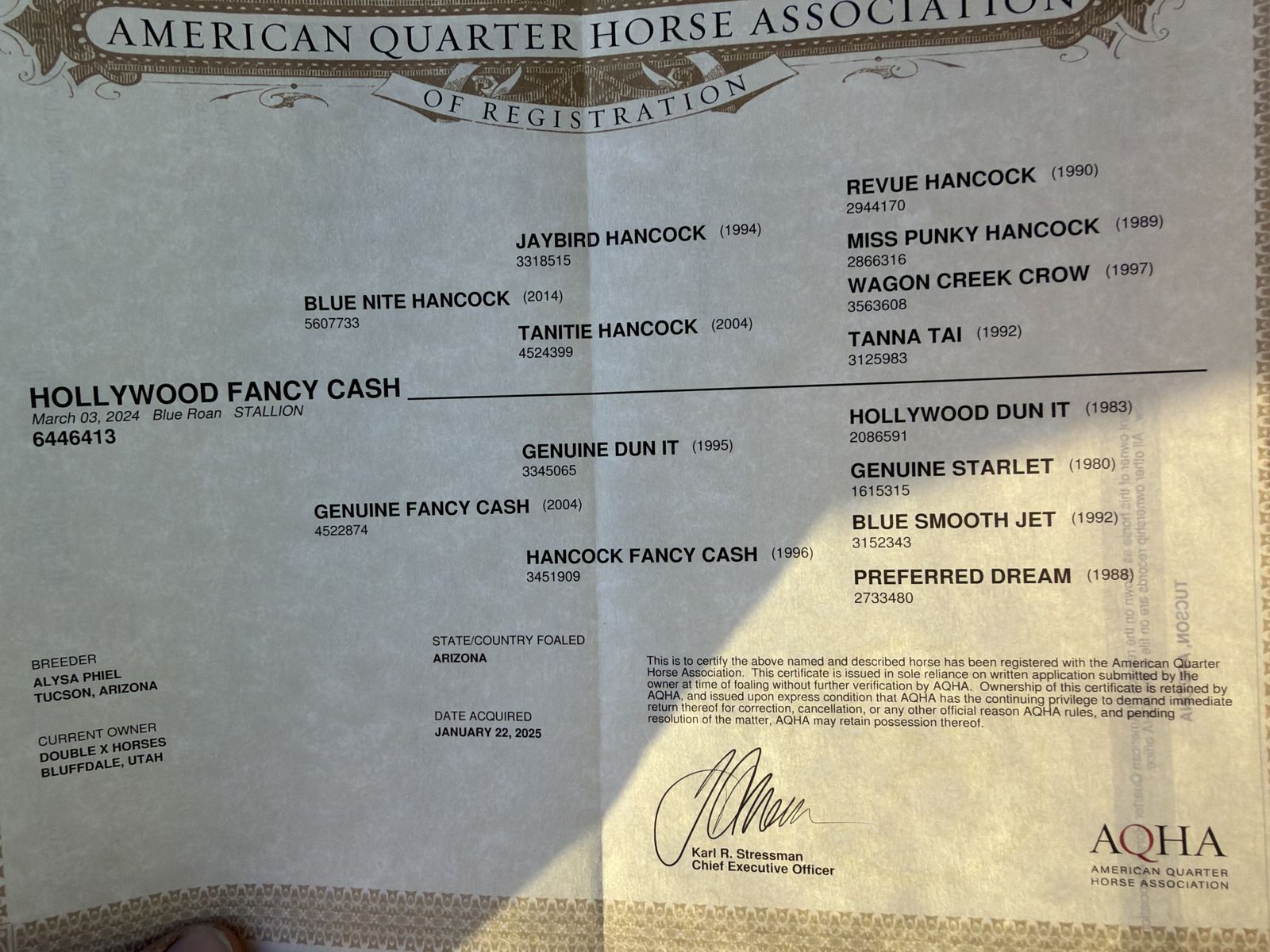 VenmoHere is a good-minded blue roan 2024 stud colt by a Blue Nite Hancock stud and out of a Genuine Fancy Cash mare. This colt combines proven Hancock durability with cow-bred performance bloodlines. He is a beautiful blue roan, correct made, and should mature close to 15.3 hands. He is exceptionally gentle and people-oriented, easy to be around, and has had consistent handling. ️ Loads and leads excellent Has been saddled and took to it super easy! ️ Stands quietly for the farrier ️ Trimmed every 6 weeks since weaning ️ Up to date on all vaccinations Has been saddled and hobbled This colt has the kind of disposition, size, and pedigree that will make a solid ranch, rope, or performance prospect, and the looks to stand out anywhere. 5750$ OBO