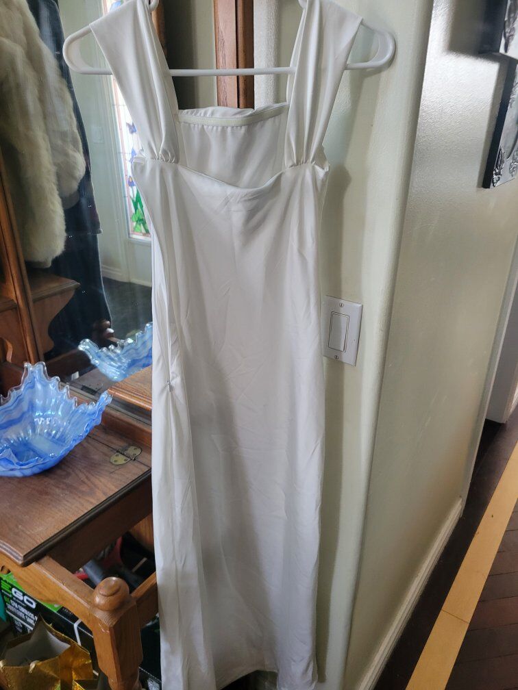 Only worn once, unfortunately I ordered it in the wrong size. Beautiful white dress made from a soft, silk-like fabric with an elegant drape and flattering fit. Perfect for an engagement party, bridal shower, rehearsal dinner, or courthouse wedding. Classic and timeless style that’s easy to dress up or down.