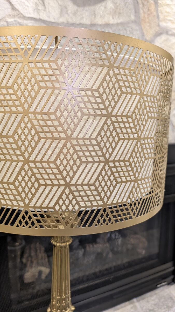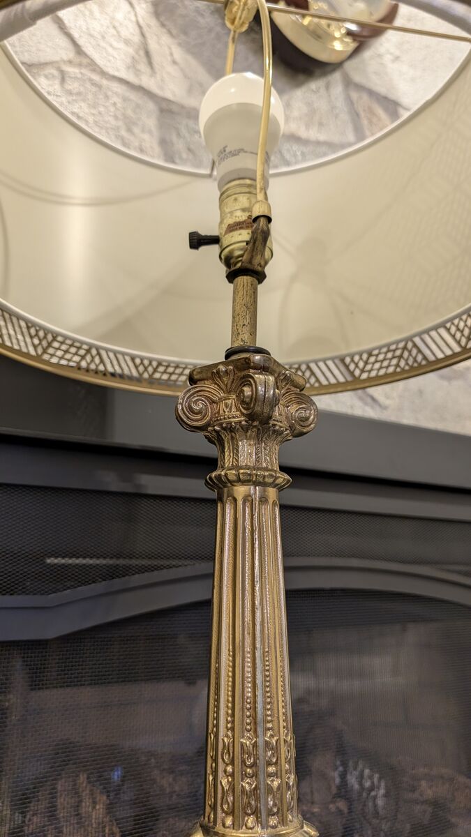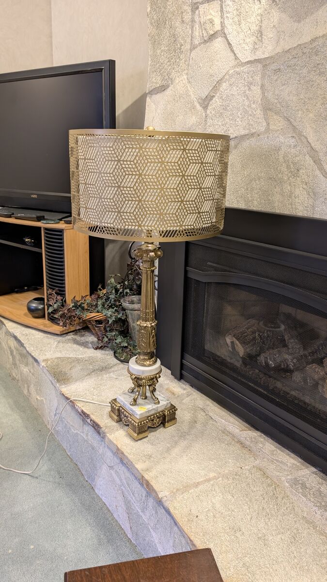 Beautiful brass lamp with a marble base, tapered brass mid-section, and a mesh brass lamp shade