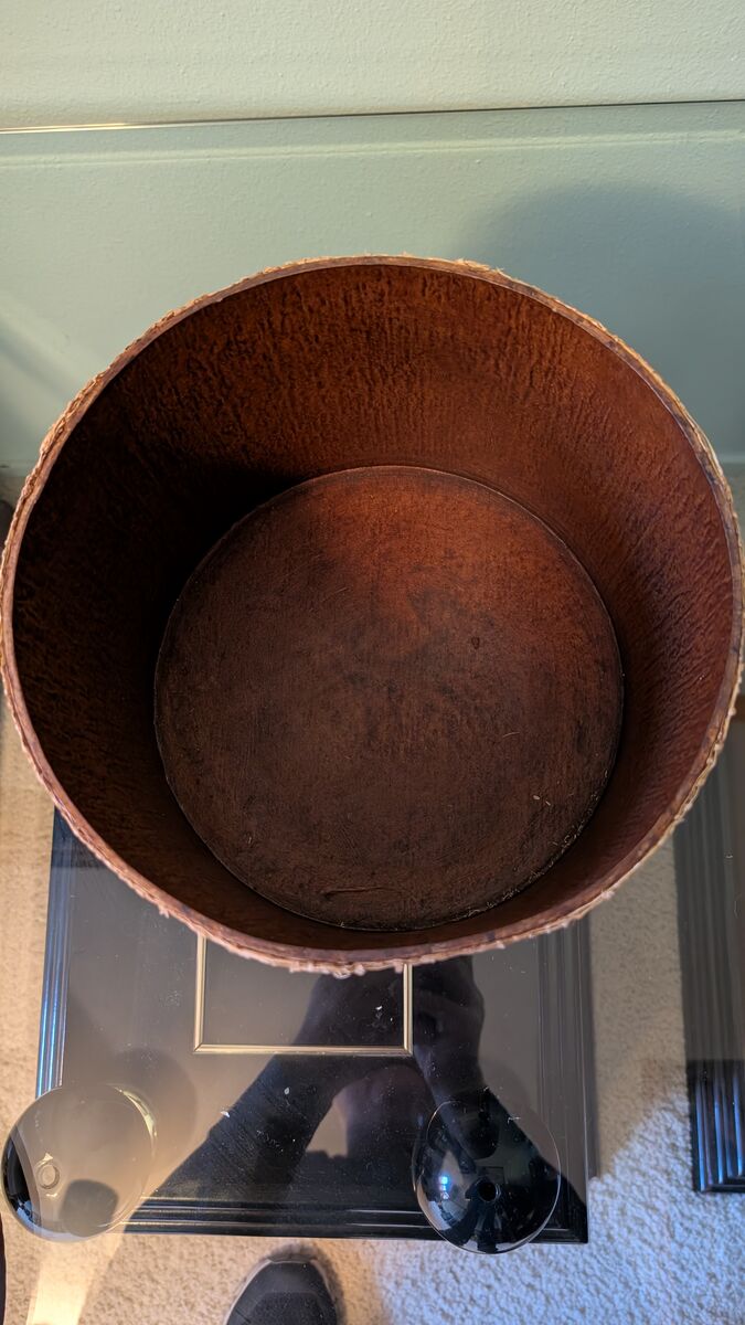 Lidded basket with fabric wrapping on side of basket