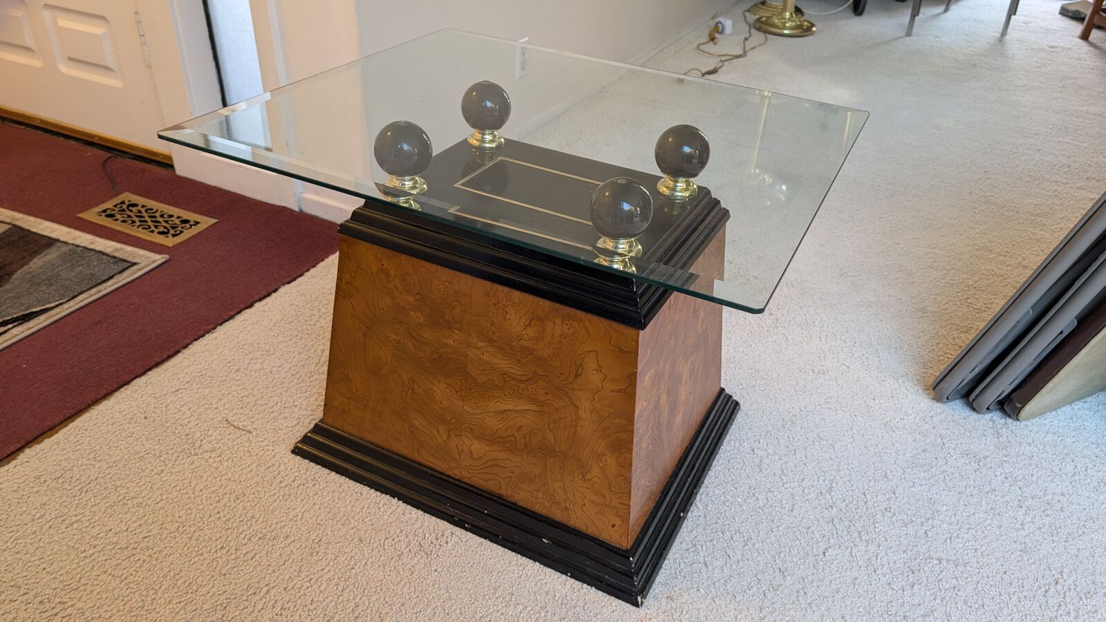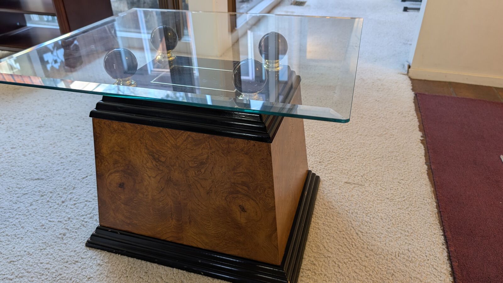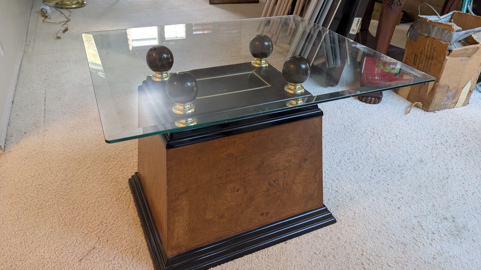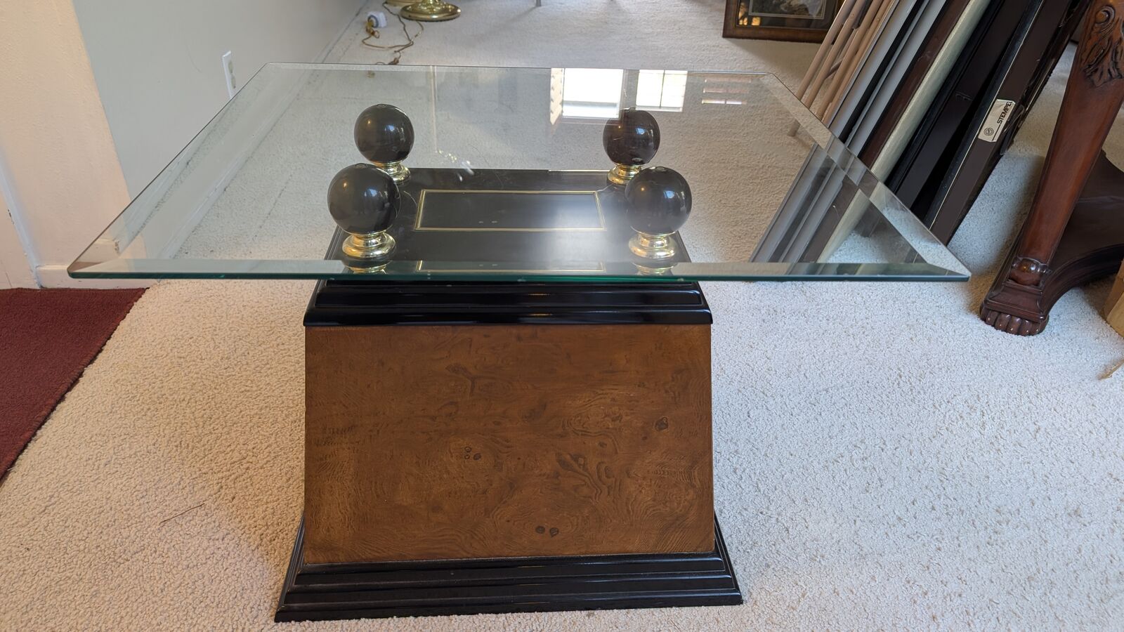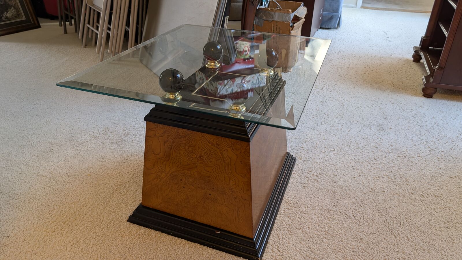 There are two rectangular elevated glass coffee tables. There is also a round one that completes the set listed separately. The rectangular tables are $200 each but if you purchase more than one, the items will be discounted.