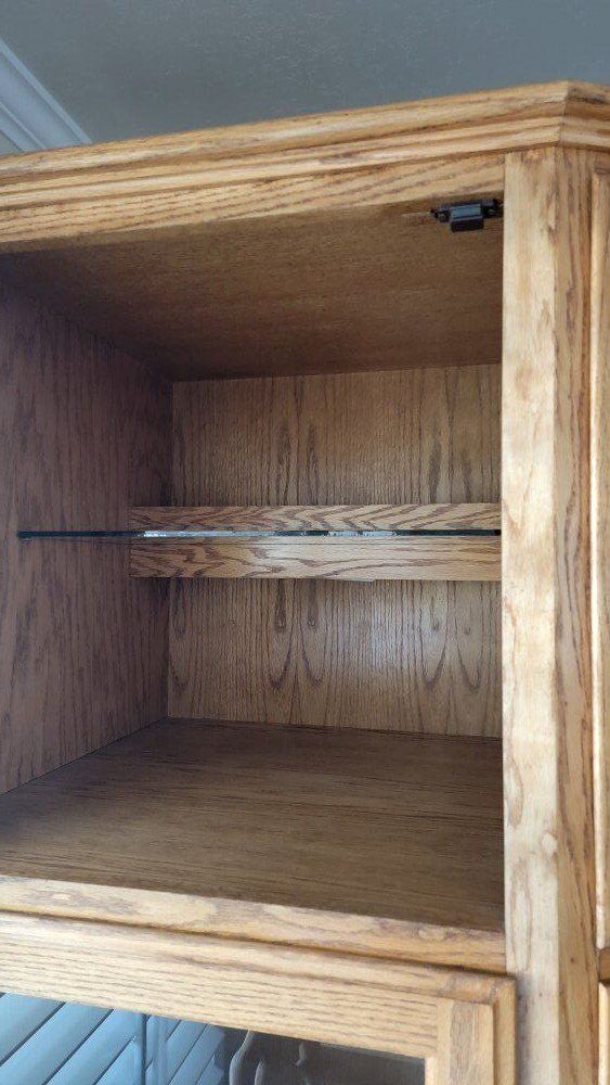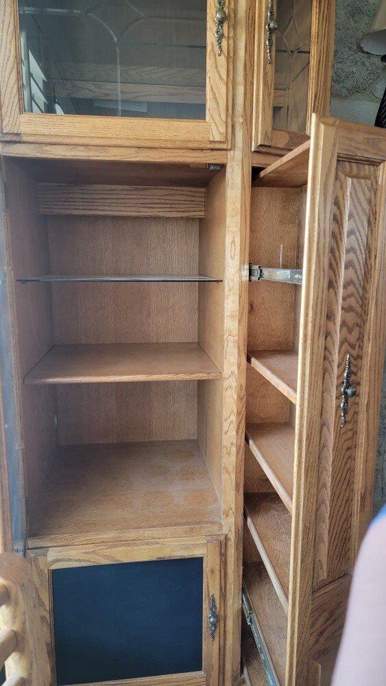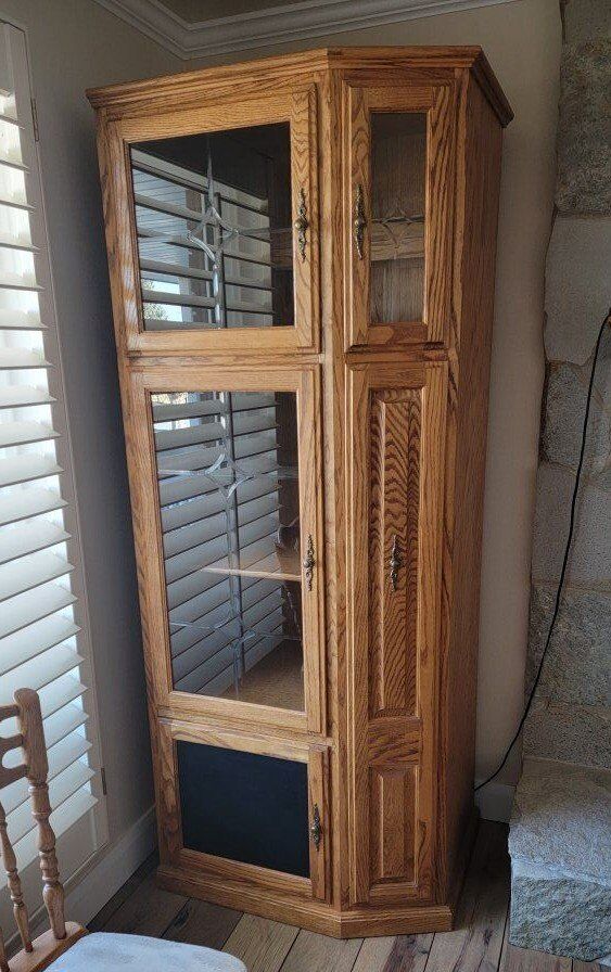 VenmoOBO!! 3 Pieces; Solid oak wood. Towers are 78.5 tall, 32 width, 23 depth TV stand is 25 tall, 40 wide, 29.25 depth Has the cut out spaces for speakers or used for storage (which was what my grandparents did). Was purchased brand new in the late 90's.
