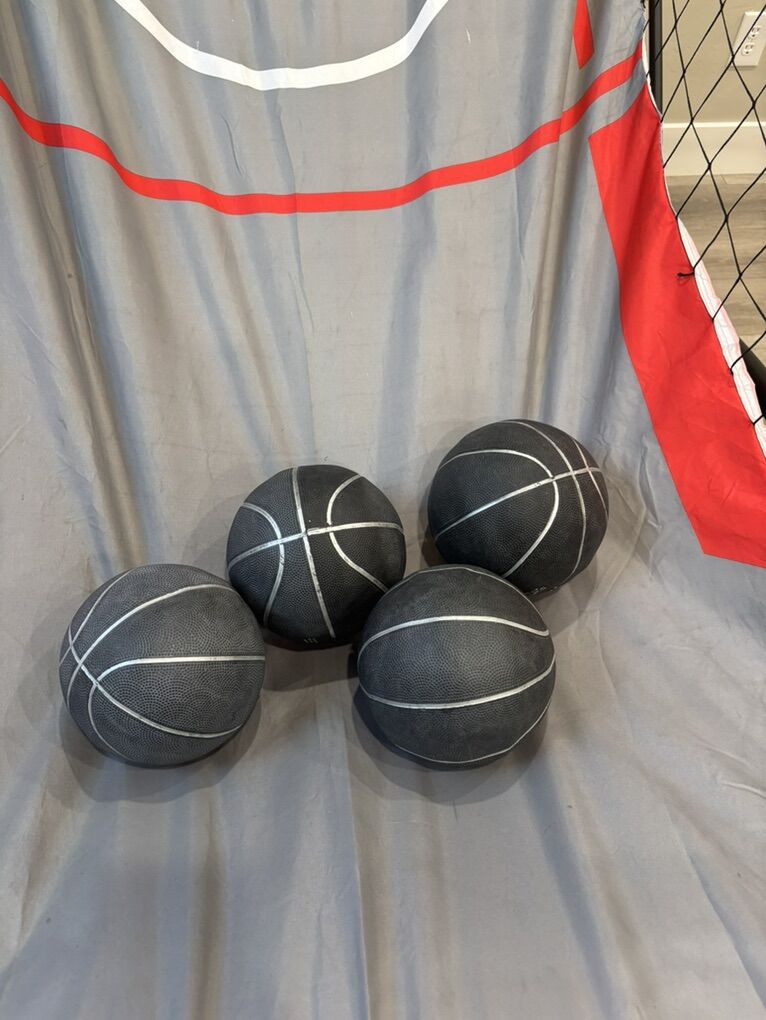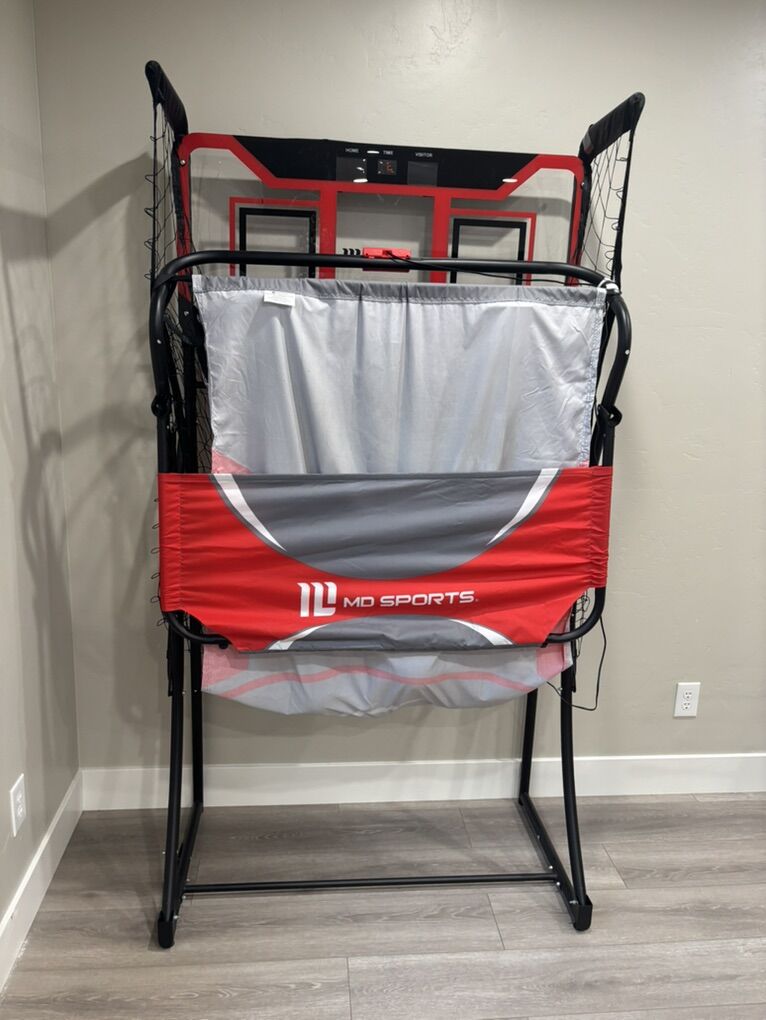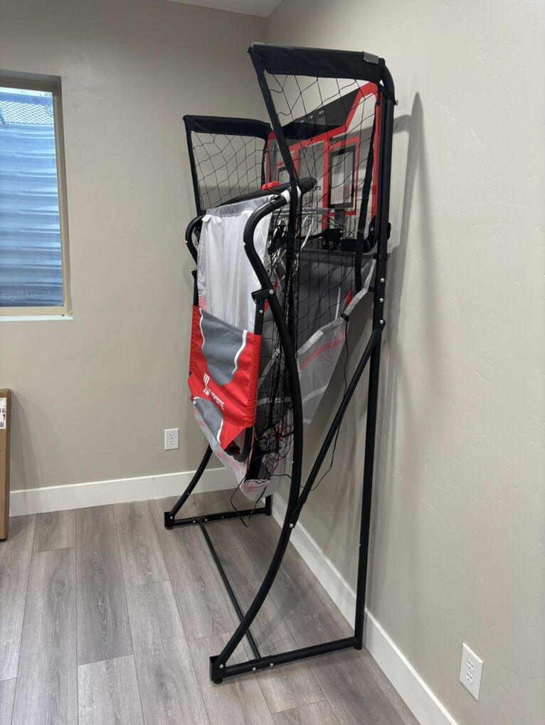 VenmoBasketball double shot hoop. Folds up for space saving. 4 balls included. Works great. Plastic backboard does have a crack on behind the left hoop, but it still works great!