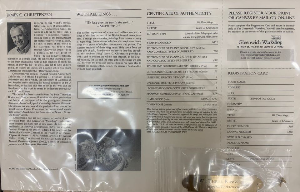 We Three Kings by James Christensen. Canvas, *numbered and signed by the artist. Brand new and in fantastic condition. See pictures for Certificate of Authenticity as well as other details. 25" w x 16" h