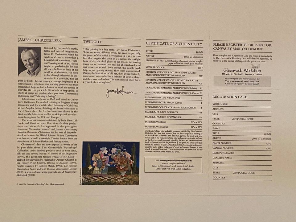 Twilight by James Christensen. Print, *numbered and signed by the artist. Brand new and in perfect condition. See pictures for Certificate of Authenticity as well as other details. 20" w x 15" h. Let me know if you have questions!