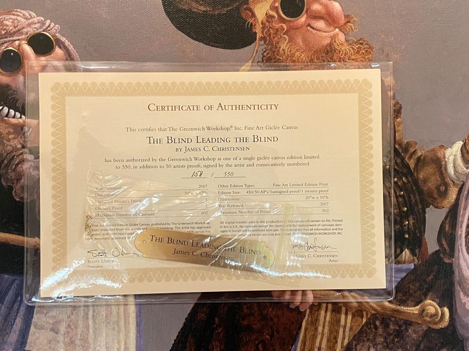 The Blind Leading The Blind by James Christensen. Canvas, *numbered and signed by the artist. Brand new and in fantastic condition. See pictures for Certificate of Authenticity as well as other details. 24" w x 12" h.