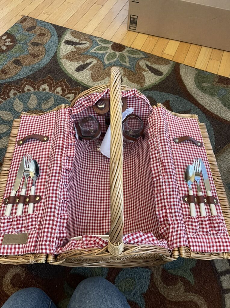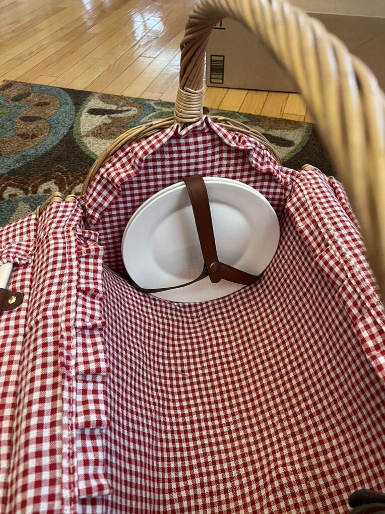 ApplePayThis is the PICNIC TIME Barrel Wicker Picnic Basket for 2, Romantic English-Style Rounded Wooden Wicker Basket with Deluxe Service for 2, Fully-Lined Interior and Handwoven, (Red & White Gingham Pattern)