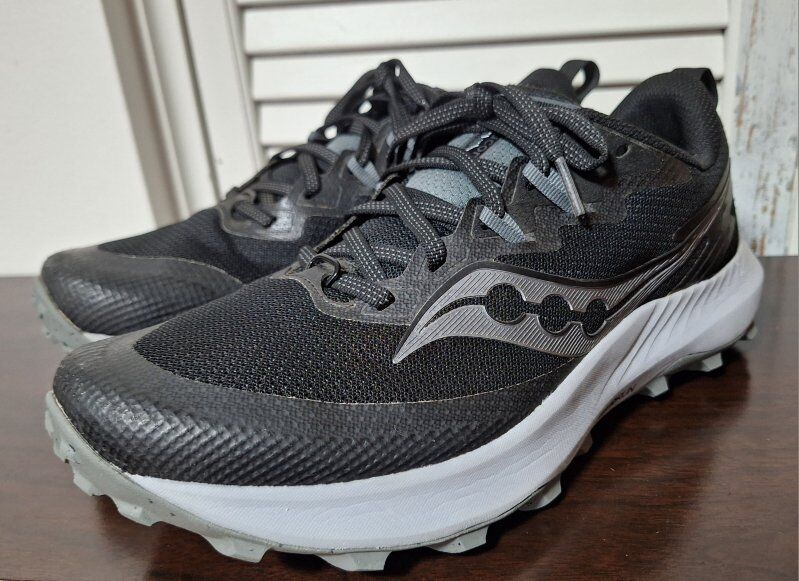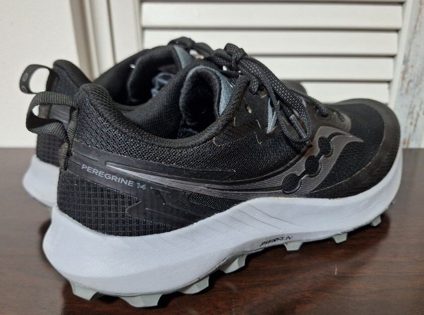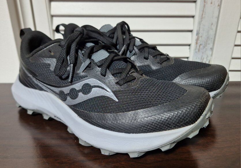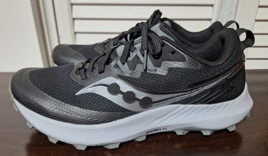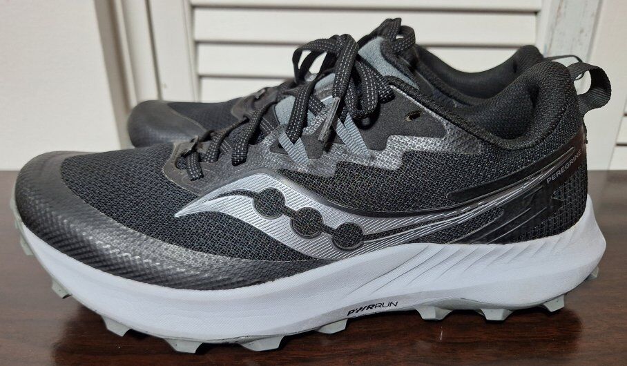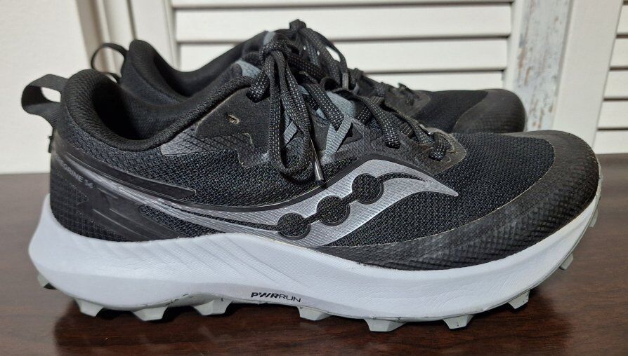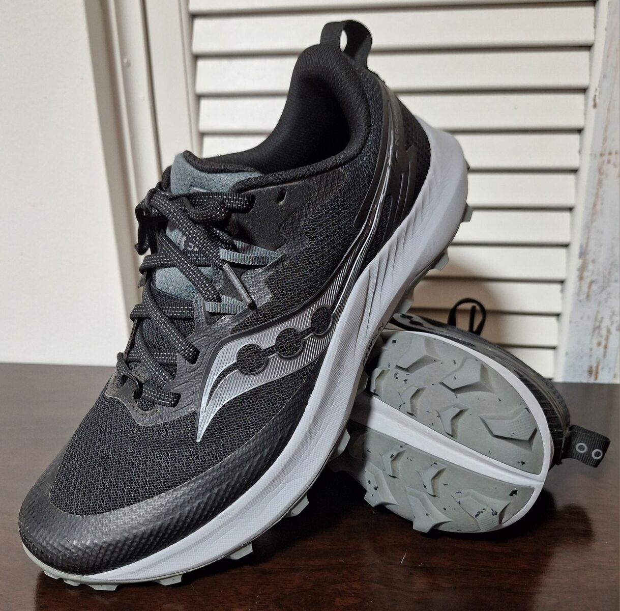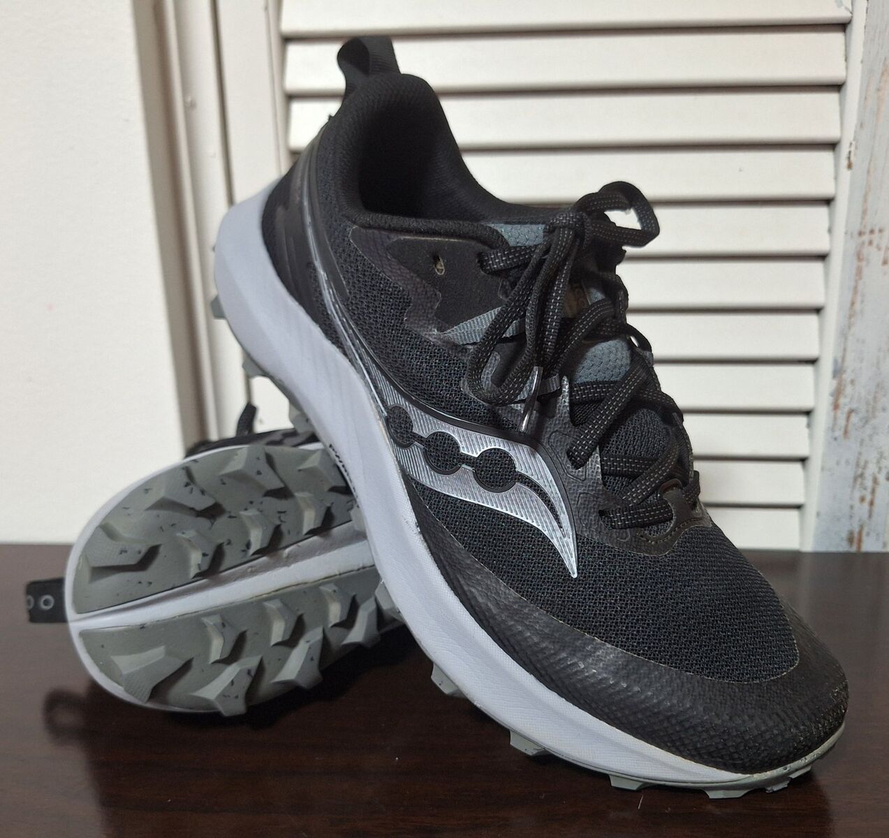 CashAppExcellent pair of Saucony Women's Peregrine 14 Trail Running Shoes. The size is US 10.5. These are a high-quality and stylish choice for active women. Featuring a low top shoe style with a lace-up closure, these black/carbon shoes offer comfort and breathability with a cushioned and mesh upper material. The rubber outsole provides traction, making them suitable for walking, cross-training, and running, while the standard shoe width ensures a comfortable fit. Comes from a smoke and pet free environment. Thanks for looking!
