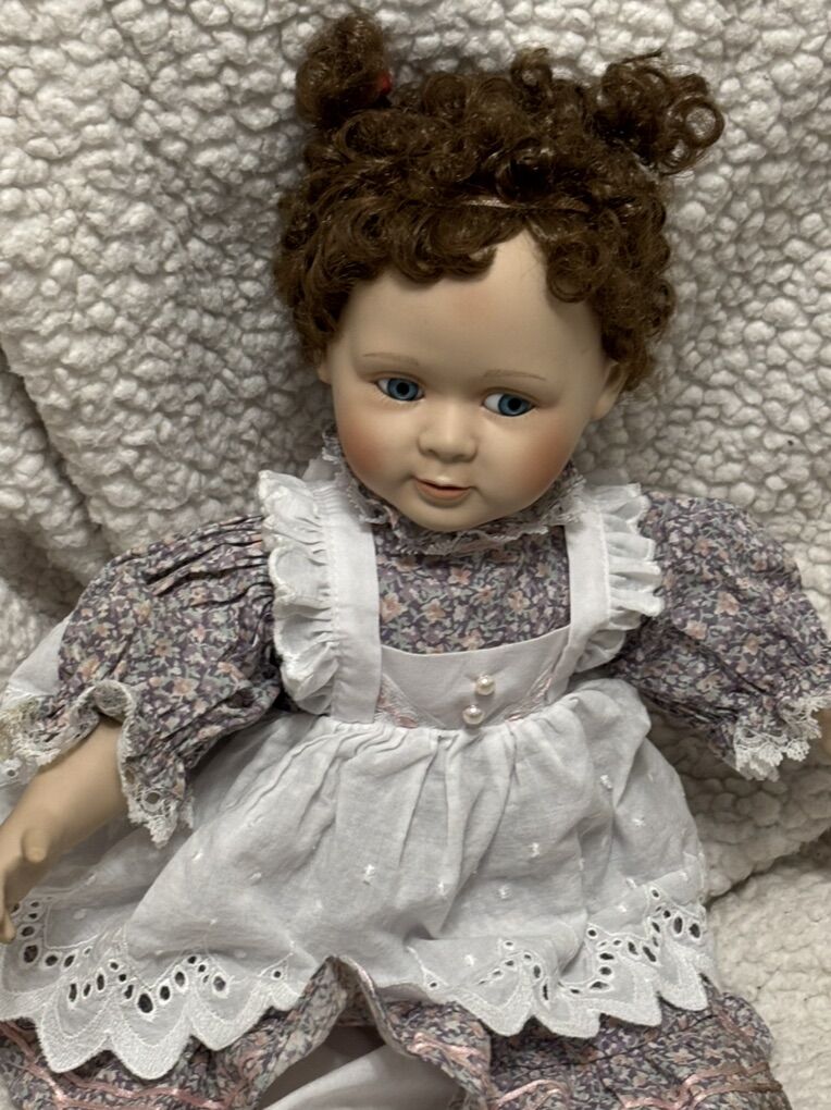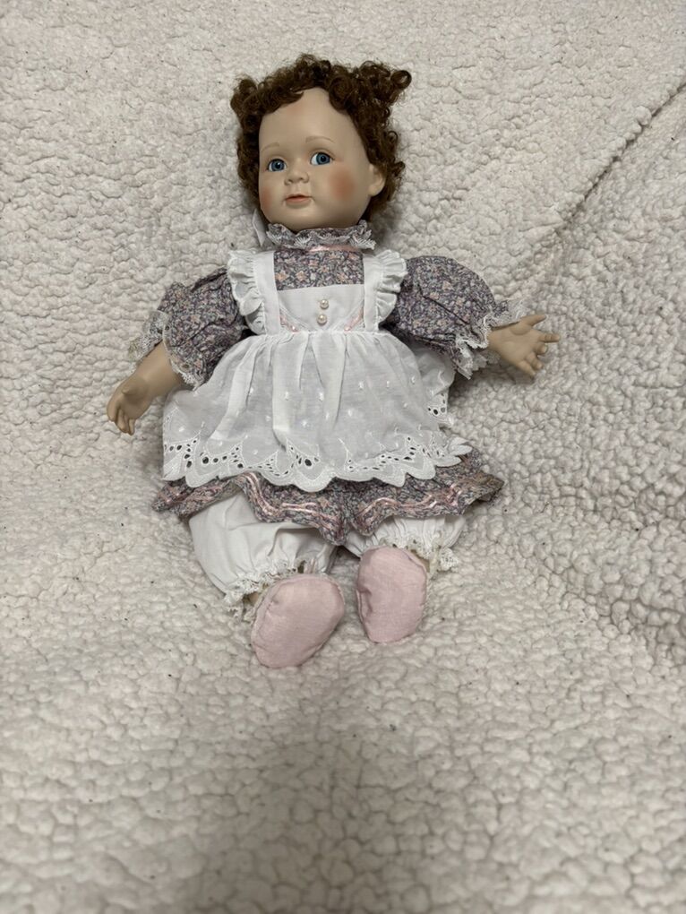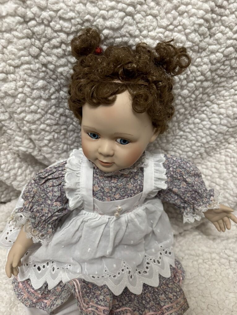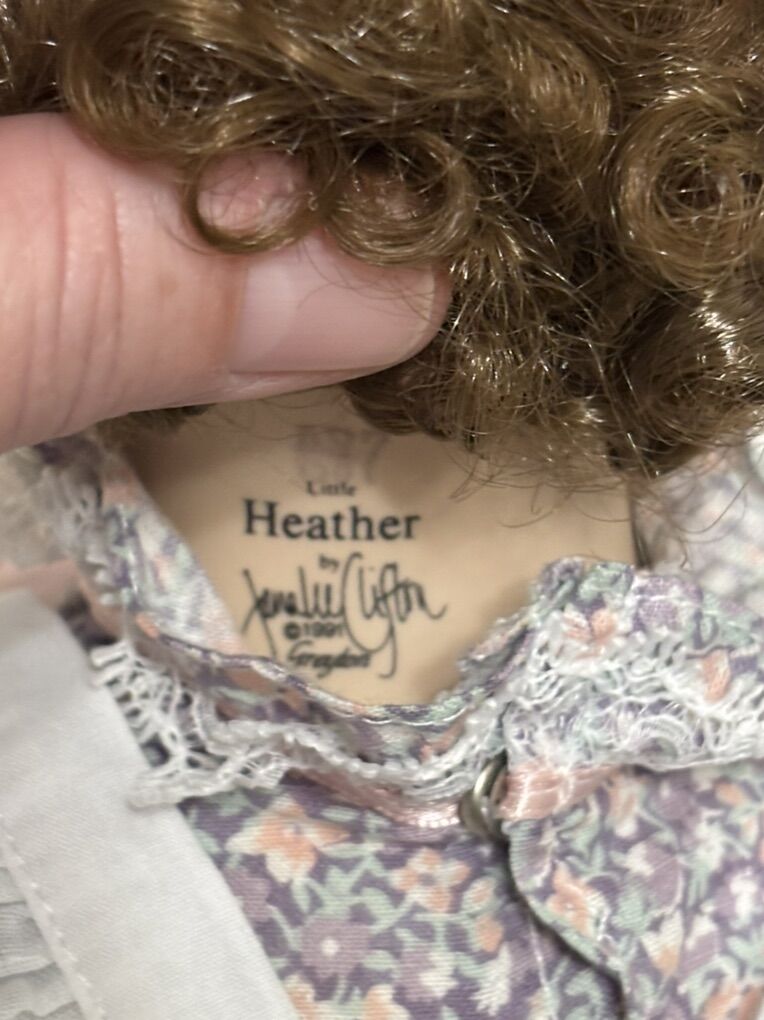 Collectible The Little Heather Doll by Jana Lee Clifton Face and Hair: The doll has brown curly hair styled in a half-updo with rosy cheeks, blue eyes, and painted lips. Outfit: She wears a floral-patterned dress with pink accents under a white apron featuring lace trim and small pearl-like buttons. Shoes: The doll has pink velvet shoes with white lace detailing. Material:The head, arms, and legs appear to be porcelain or bisque, while the body is likely cloth. Style:The doll resembles a classic, collectible porcelain doll with intricate detailing on the clothing and accessories. No advance payment Payment and pick up are at the same time.