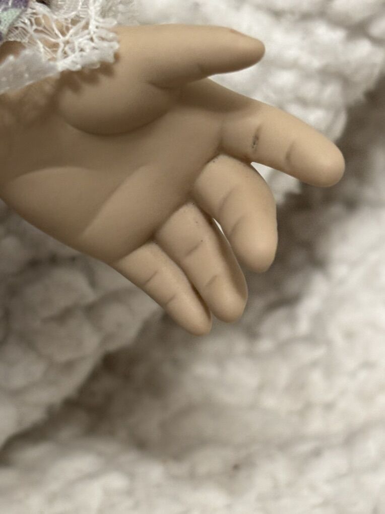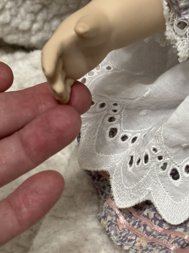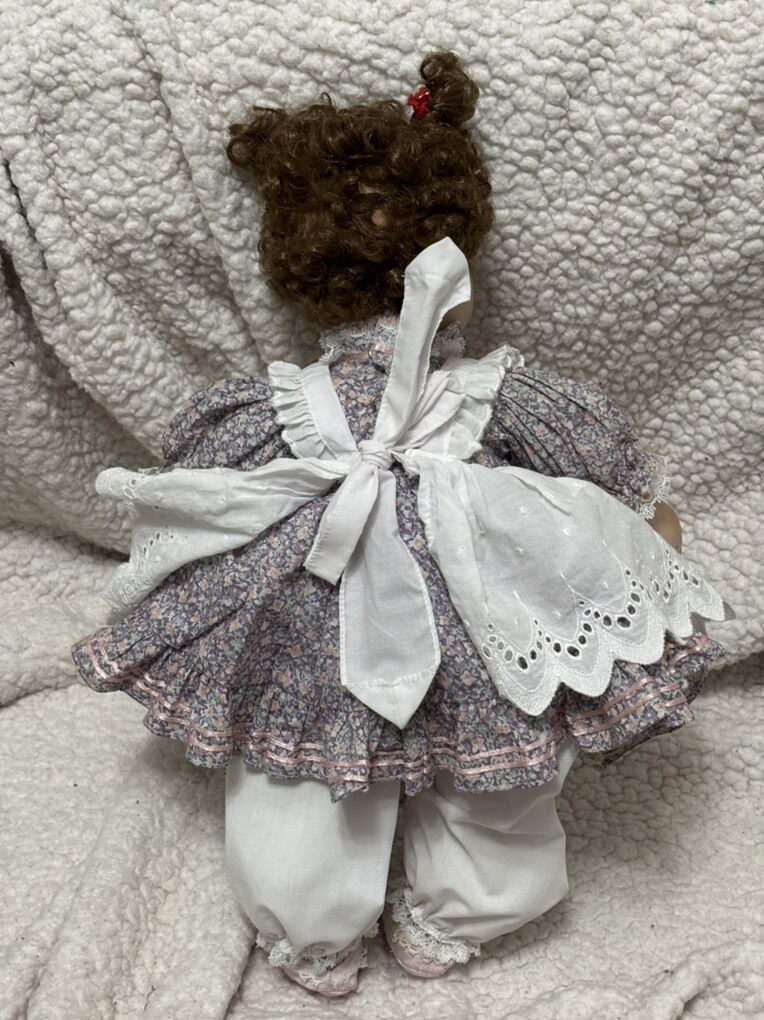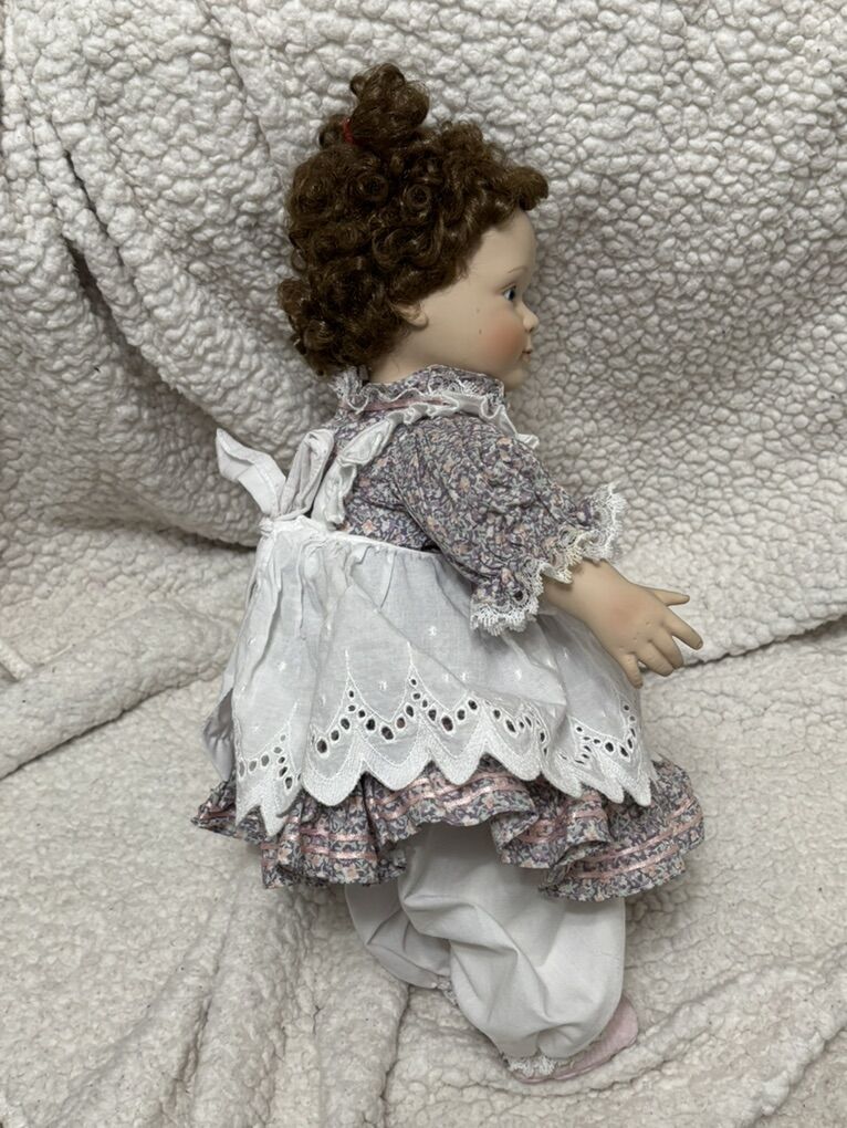 Collectible The Little Heather Doll by Jana Lee Clifton Face and Hair: The doll has brown curly hair styled in a half-updo with rosy cheeks, blue eyes, and painted lips. Outfit: She wears a floral-patterned dress with pink accents under a white apron featuring lace trim and small pearl-like buttons. Shoes: The doll has pink velvet shoes with white lace detailing. Material:The head, arms, and legs appear to be porcelain or bisque, while the body is likely cloth. Style:The doll resembles a classic, collectible porcelain doll with intricate detailing on the clothing and accessories. No advance payment Payment and pick up are at the same time.