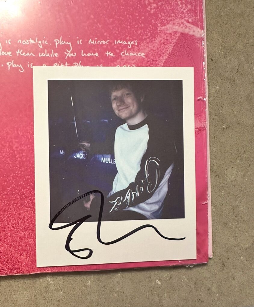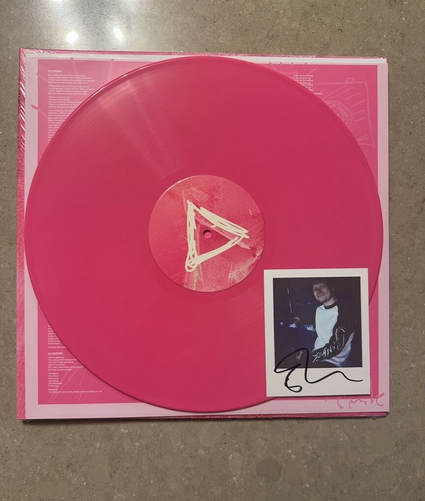 Contains 1 signed polaroid by Ed Pink opaque coloured vinyl housed in a printed gatefold outer sleeve, with insert and soft touch matte finish. Artwork includes full album lyrics and credits. Includes 1 Signed Polaroid. I had some issues with other Ed Sheeran albums not having what they were supposed to have in them so I VERY CAREFULLY slit the side of the plastic wrap open to make sure the signed Polaroid was there. So this is the exact picture and signature you would get! Although it is open it has never been played. I took pictures of everything and then put it in another protective sleeve to keep it extra protected.