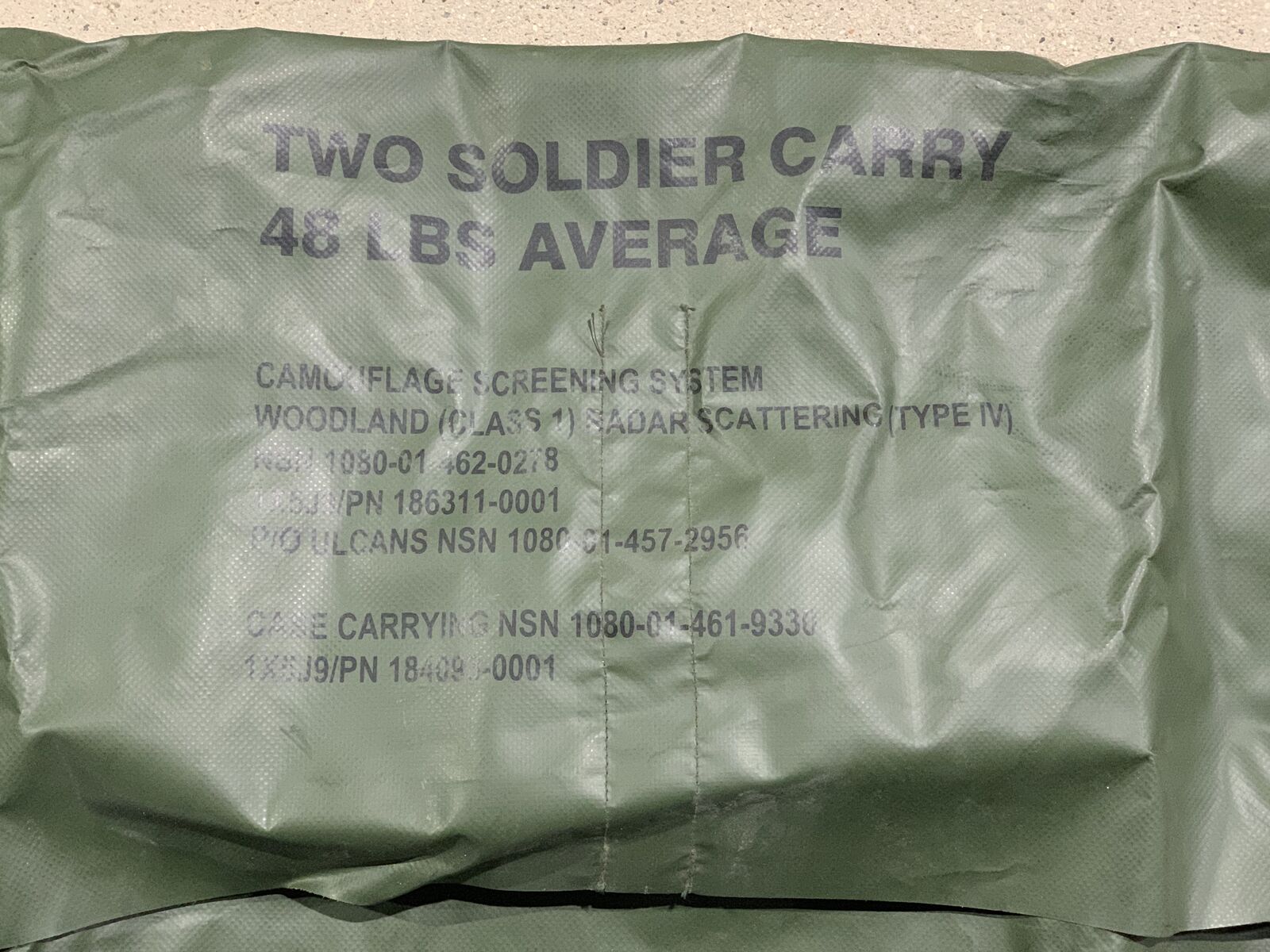 Military surplus camouflage screening system transport case (also called a "burrito bag") for radar scattering camo nets.