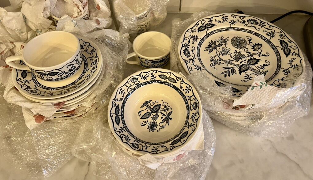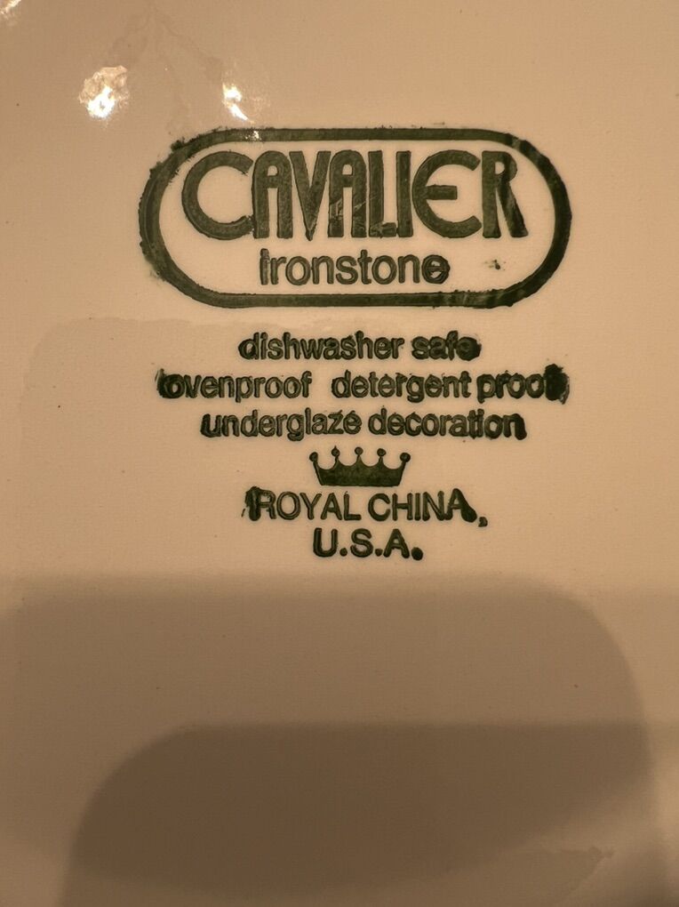 VenmoCavalier ironstone Royal China, blue onion, antique style dinner set. Quantities are as follows.: 8 - 10” dinner plates, 7 - cups, 13 -cup saucers, 5 -bowls. They are all in great condition. One plate has a small chip on the edge.