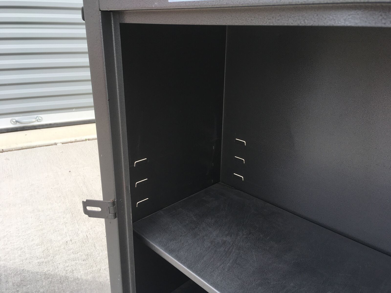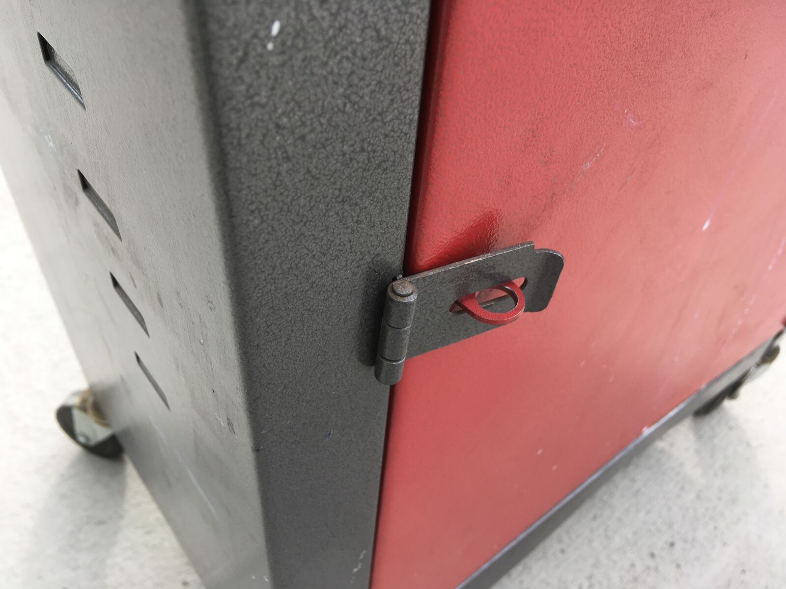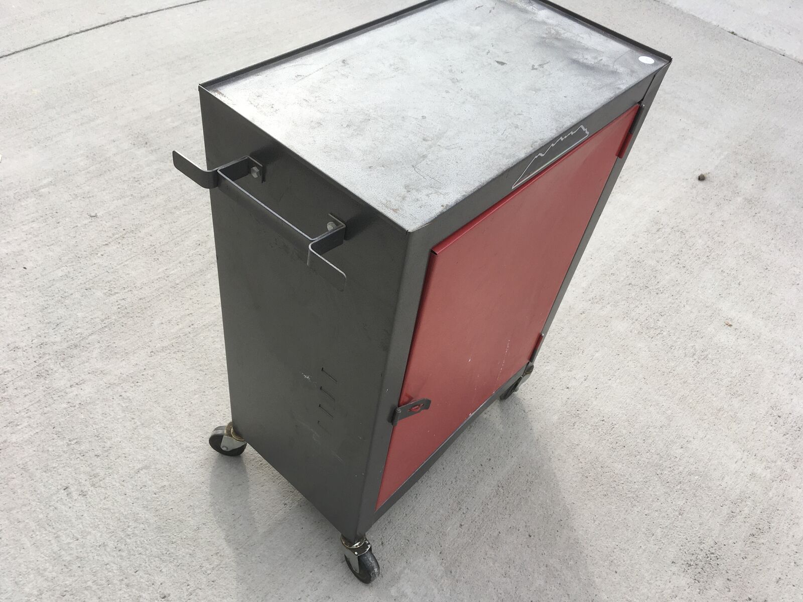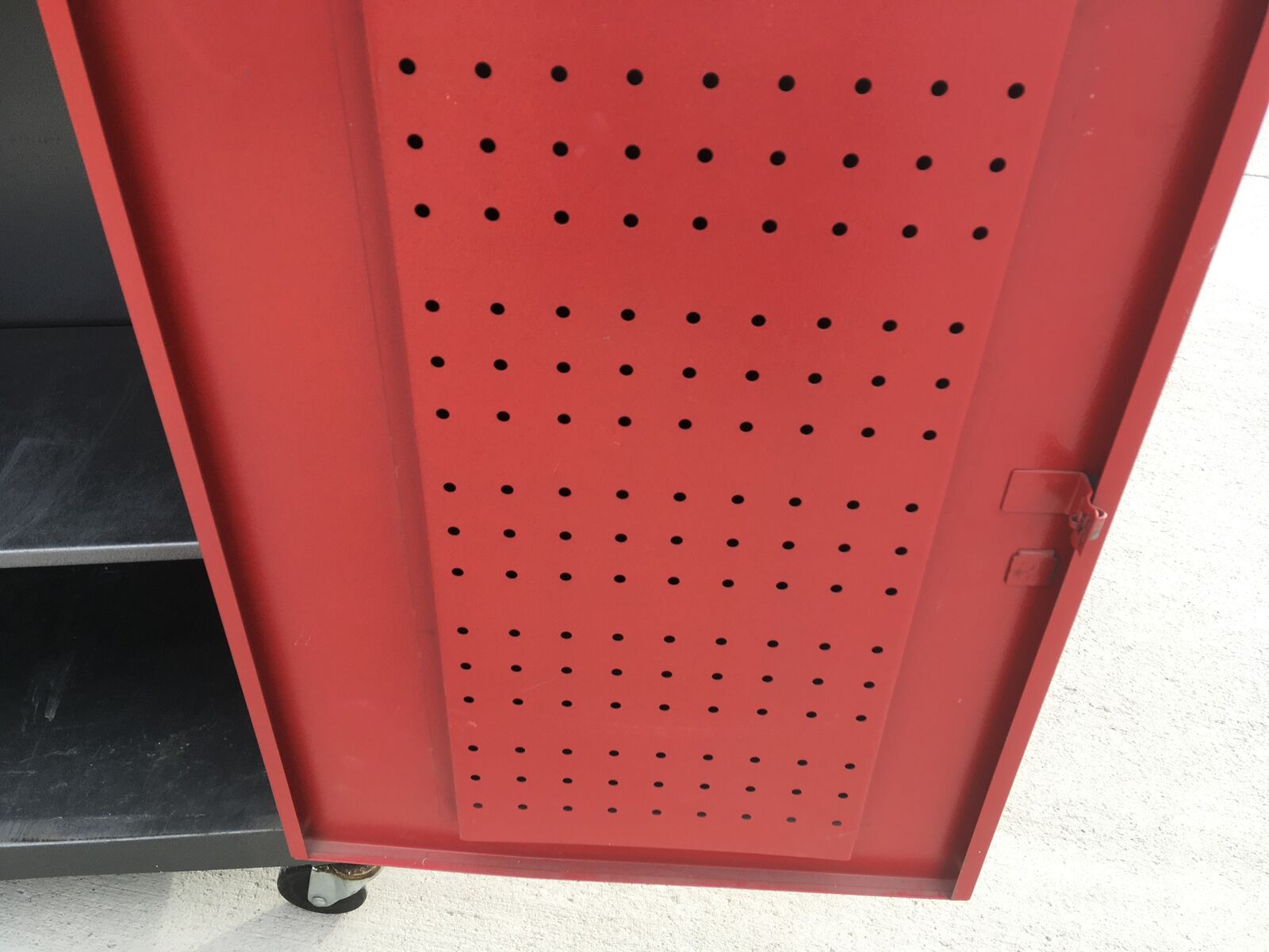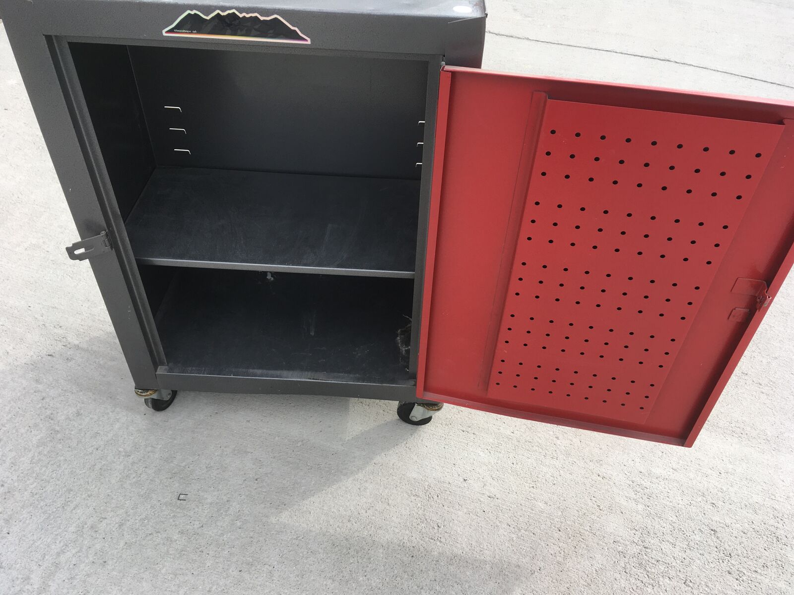 Loackable door. Pushing chest with handle. Integrated metal peg board. Adjustable Shelf. 18" X 11", 25" tall.
