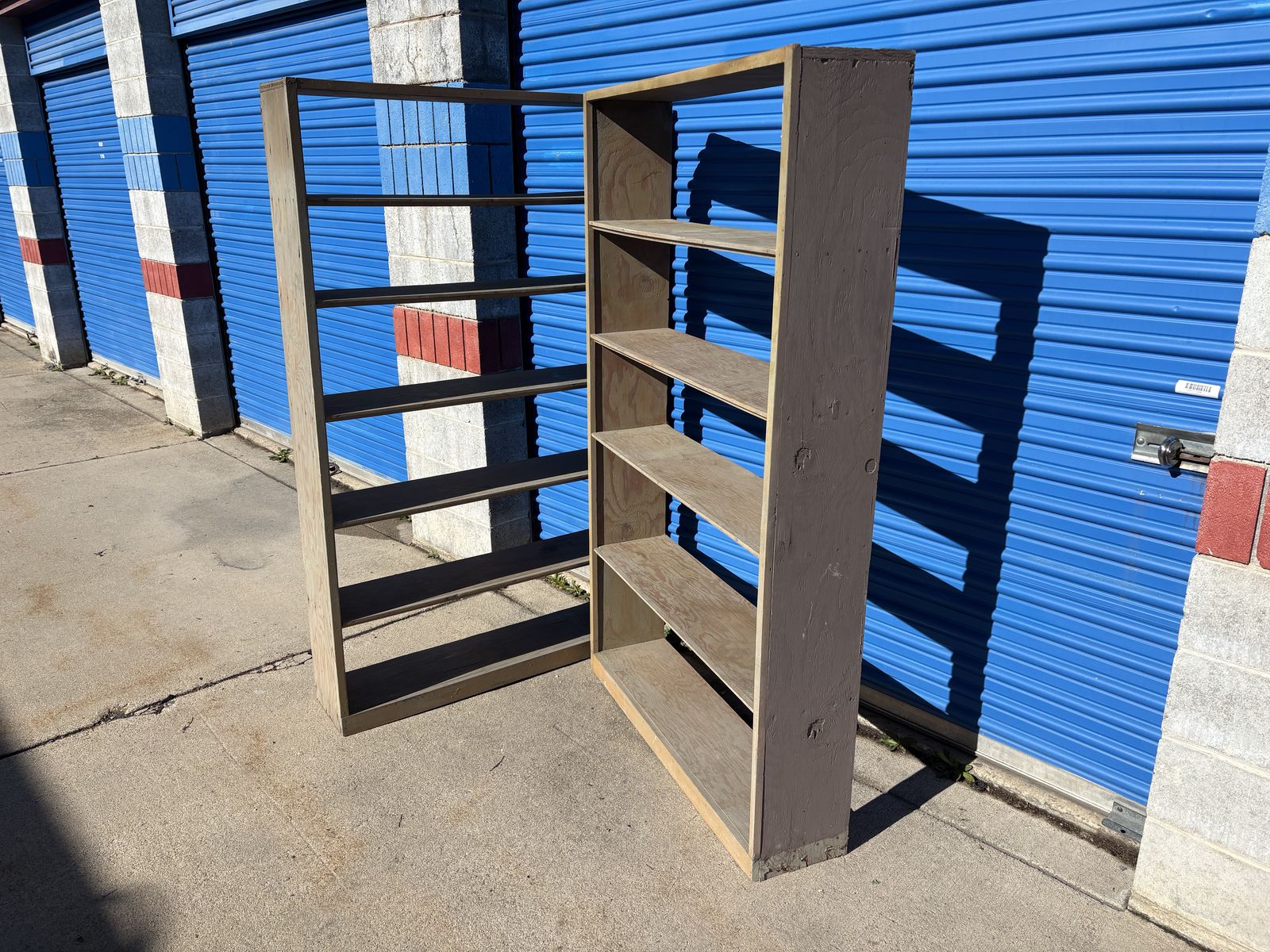 VenmoWe have two of these, price is for each. Measures 71”H x 43.5”W x 10.5”D. Very practical Classic wood shelves came out of a storage room we are remodeling. Some cosmetic wear, could use some cleaning or a coat of paint. Solid plywood, these were screwed into a wall, could add a backside plywood piece to be freestanding. Would be great in garage, pantry, food storage or craft room.